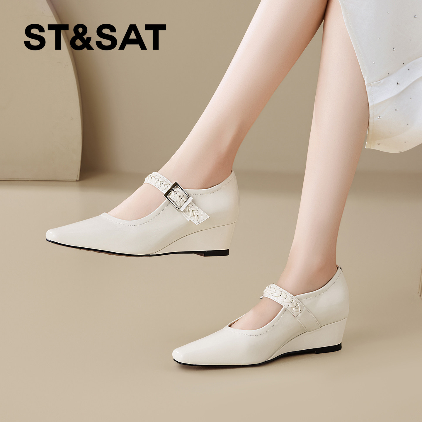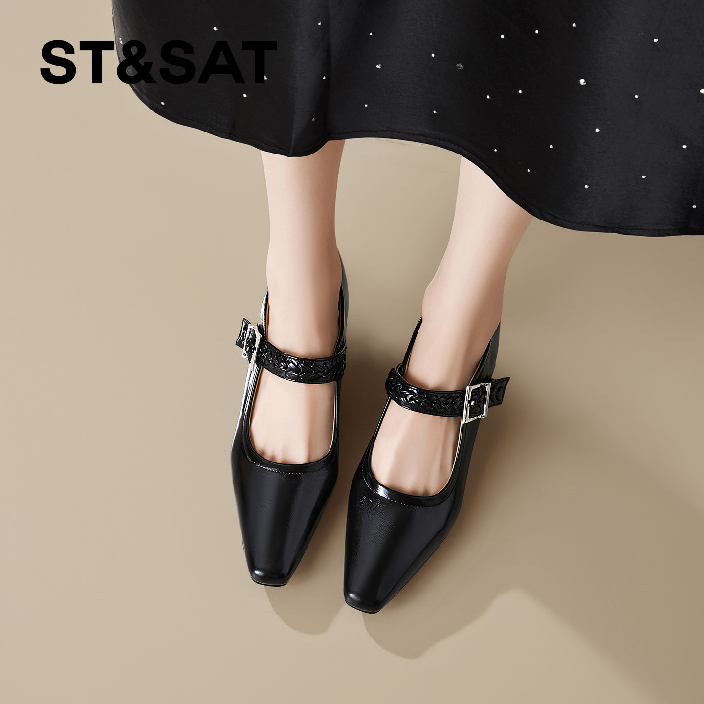 星期六真皮方头坡跟玛丽珍鞋女2026年春季新款浅口单鞋通勤工作鞋