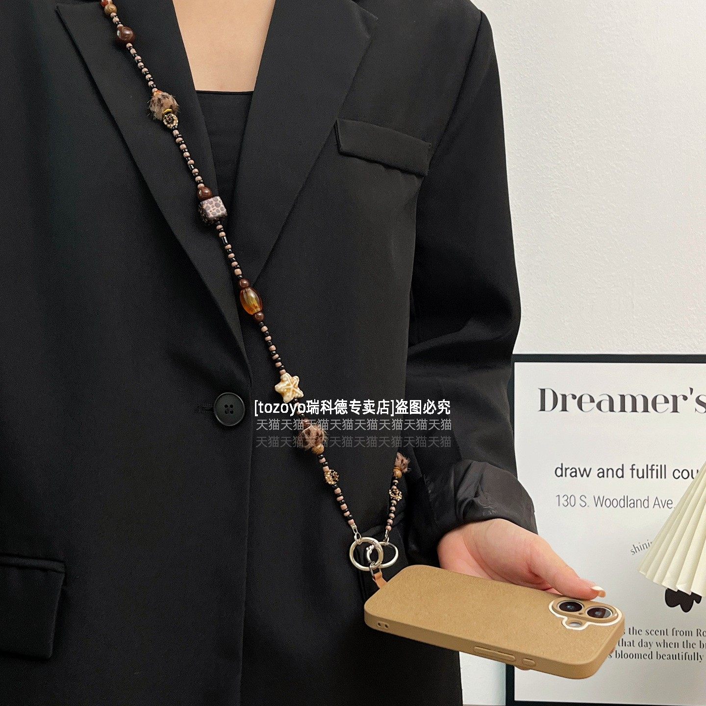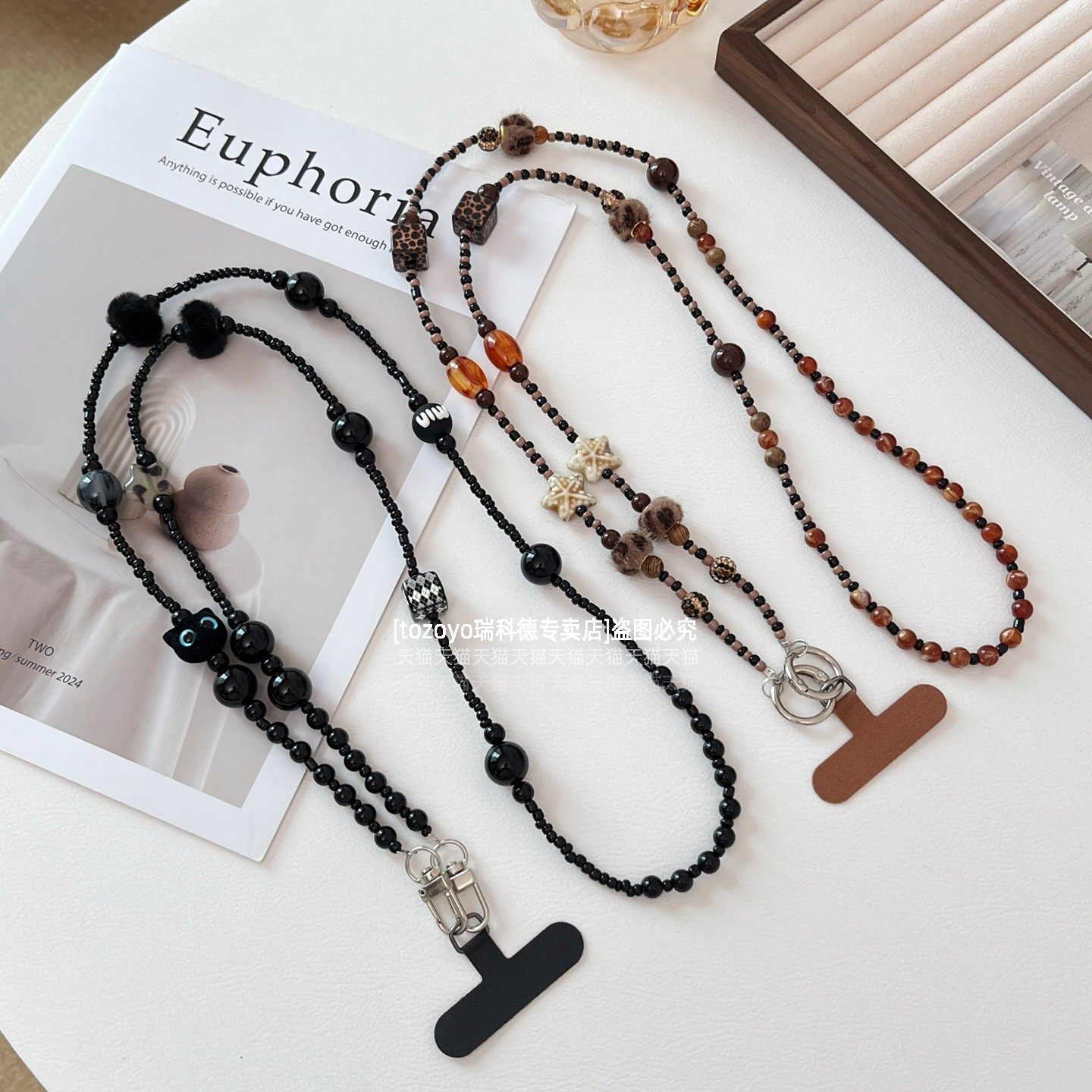 带毛球串珠手机链秋冬氛围感挂件斜挎可背手工串珠链条长款背带挂链包包相机挂绳挂饰猫咪时髦豹纹个性海星壳