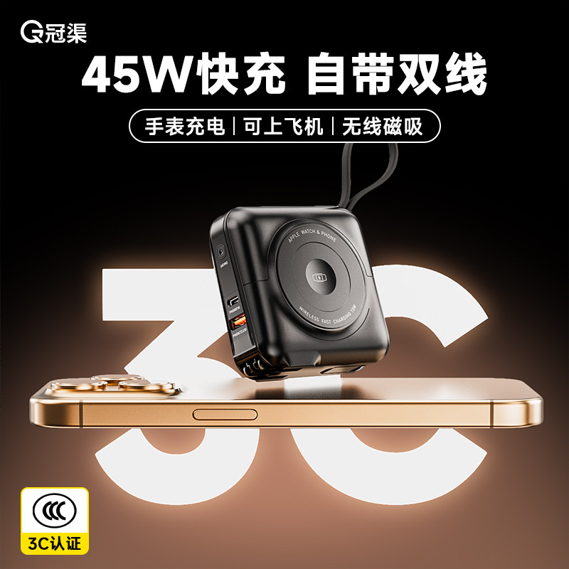 充电宝2025新款自带线AC插头45W快充适用苹果16磁吸apple watch手表充电器便携15000毫安magsafe无线充电器