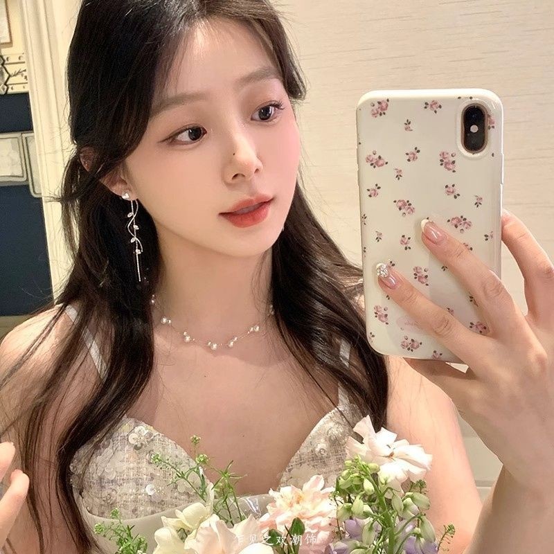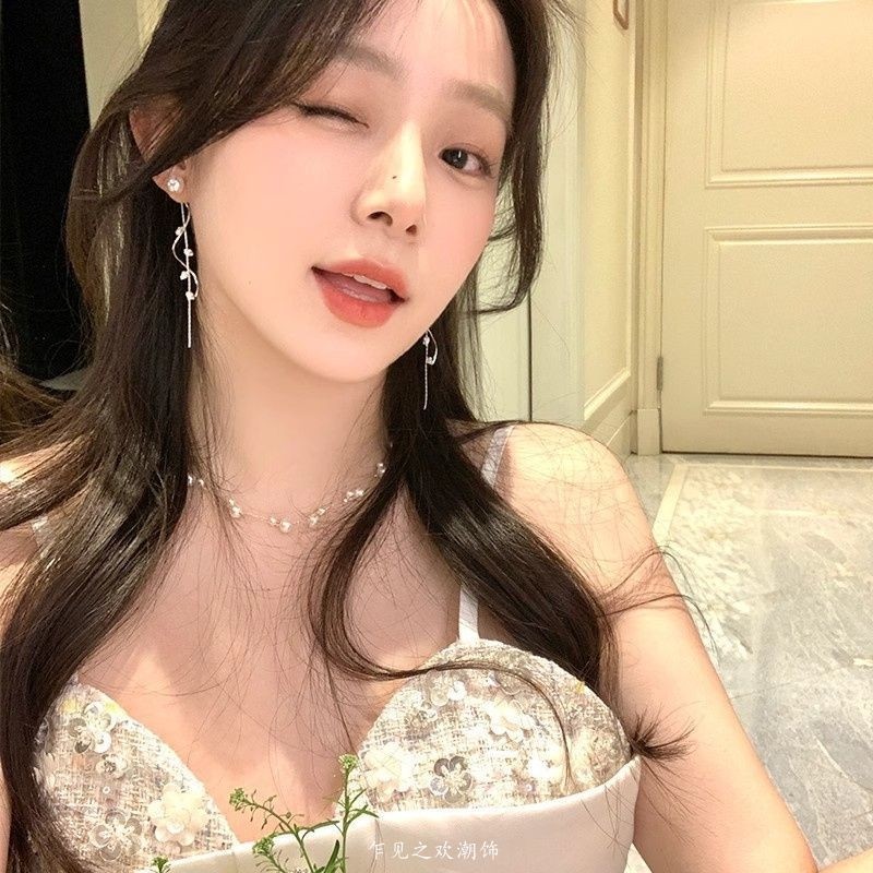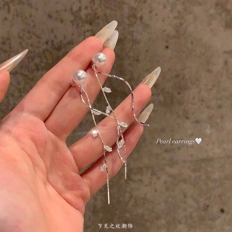 韩系闪锆树叶珍珠流苏耳环女轻奢高级感气质耳钉耳饰无耳洞耳夹