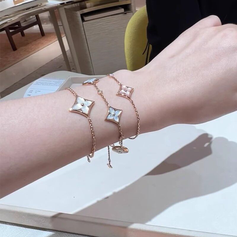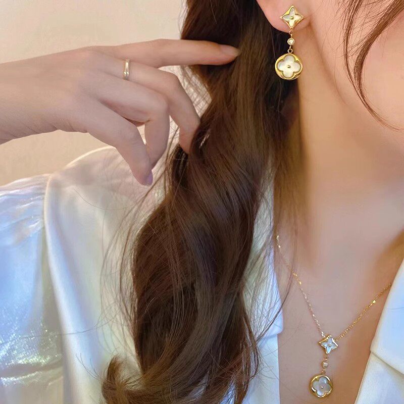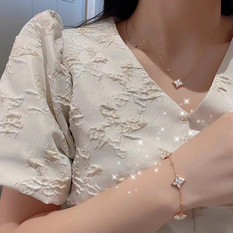 高版本菱形四叶草项链玫瑰金四花贝母手链中古银饰戒指饰品套装