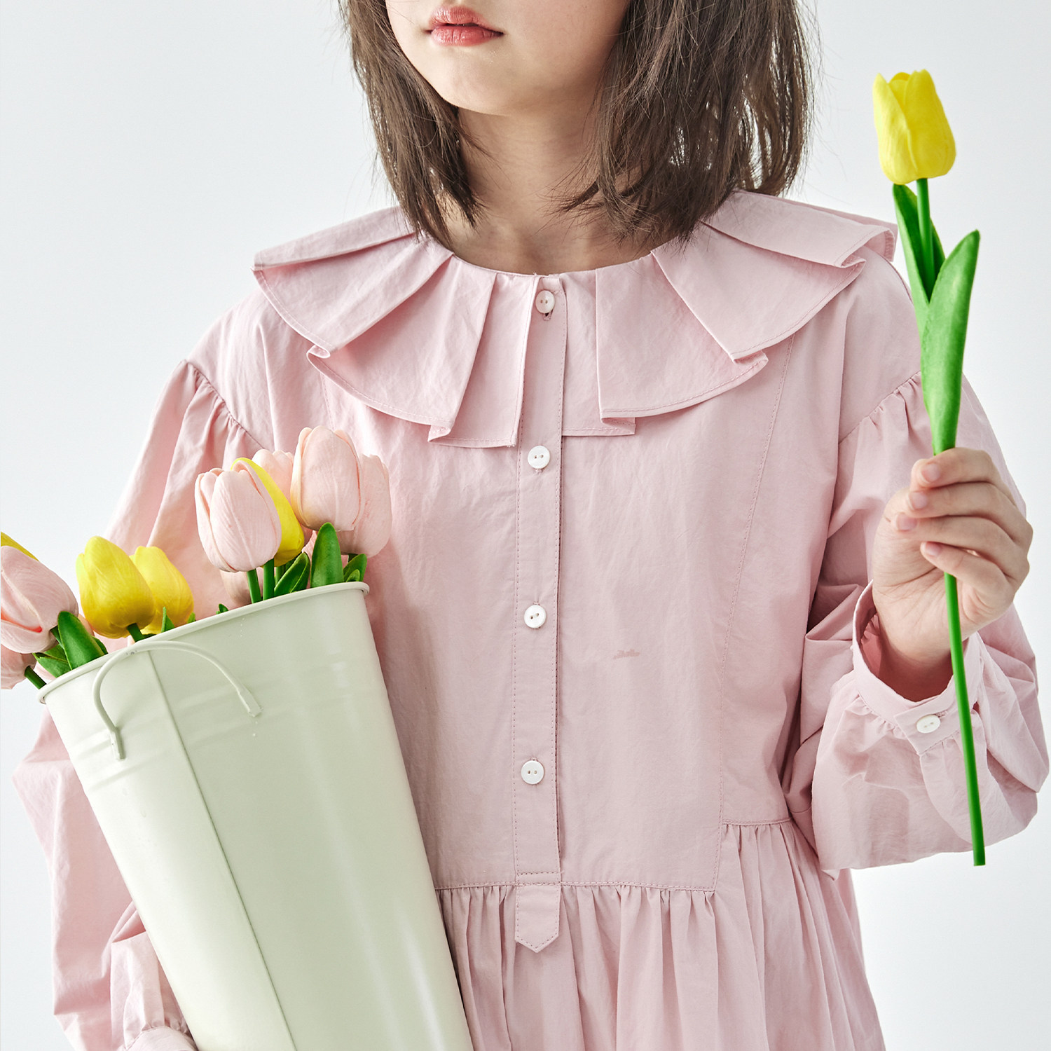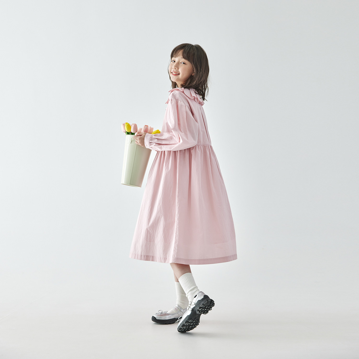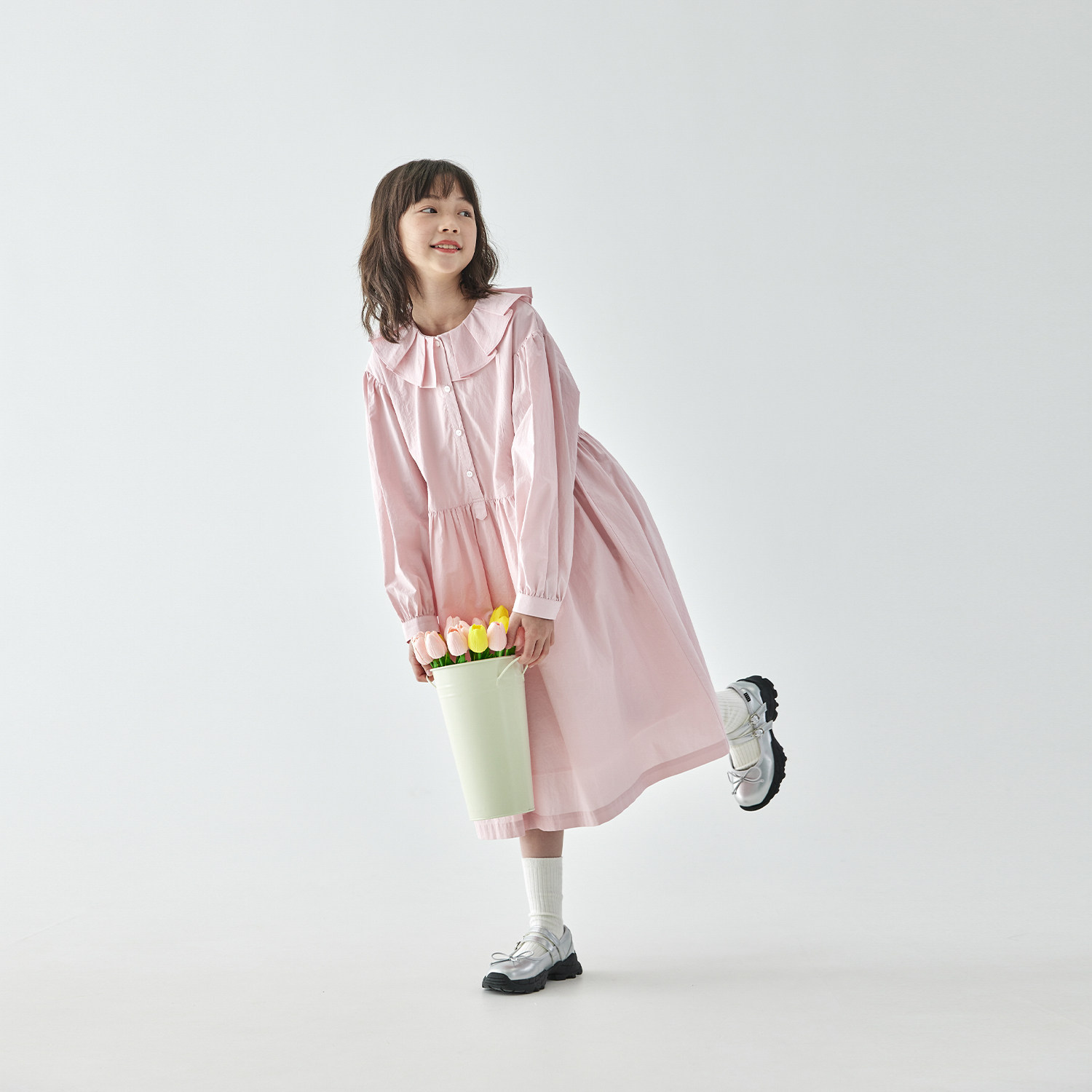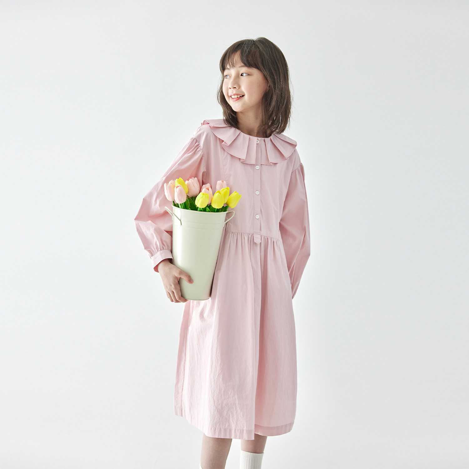 棵初2026年春季中大女童花瓣领长袖连衣裙亲子装全棉收腰衬衫裙