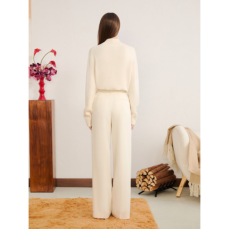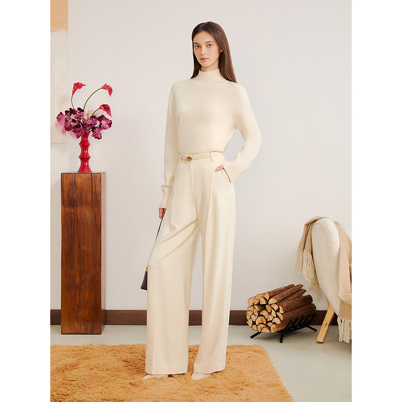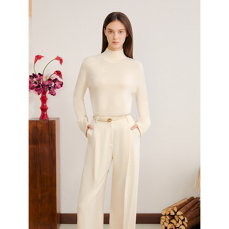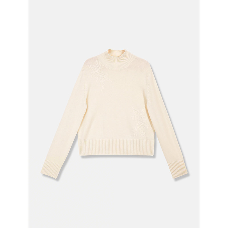 YINER音儿2025冬季新款美丽诺羊毛羊绒混纺米白绣花半高领针织衫