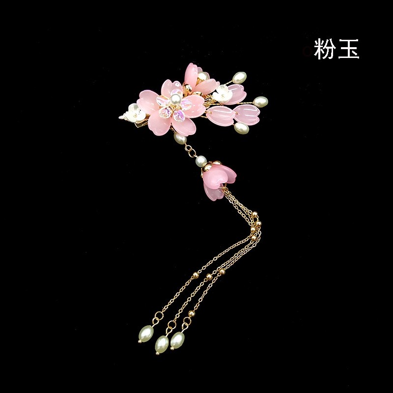 古风汉服头饰流苏边夹粉玉花朵发夹发簪步摇侧边发夹仿玉花朵粉樱