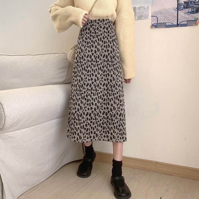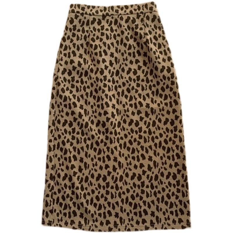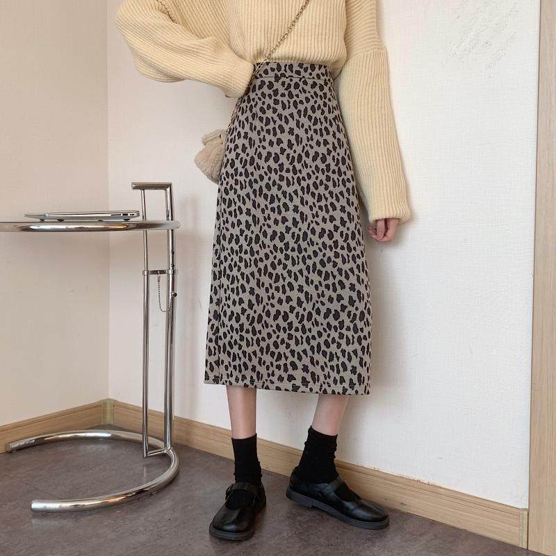 大码复古豹纹开叉半身裙女秋冬胖mm显瘦遮胯垂感A字中长款包臀裙