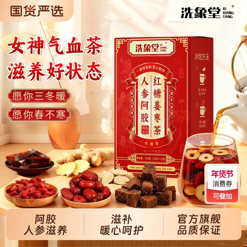 洗象堂人参阿胶红糖姜枣茶大姨妈生姜姜茶姜汁补气养血礼盒装红枣