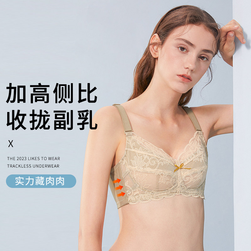 润微茶肌内衣女士大胸显小薄款收副乳聚拢大码上托防下垂蕾丝文胸