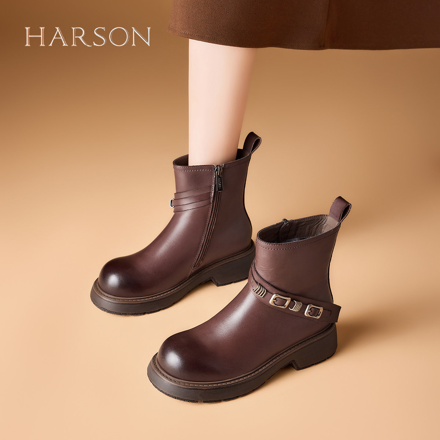 哈森真皮保暖短靴女26冬季冬款爆款加绒机车靴厚底时装马丁靴