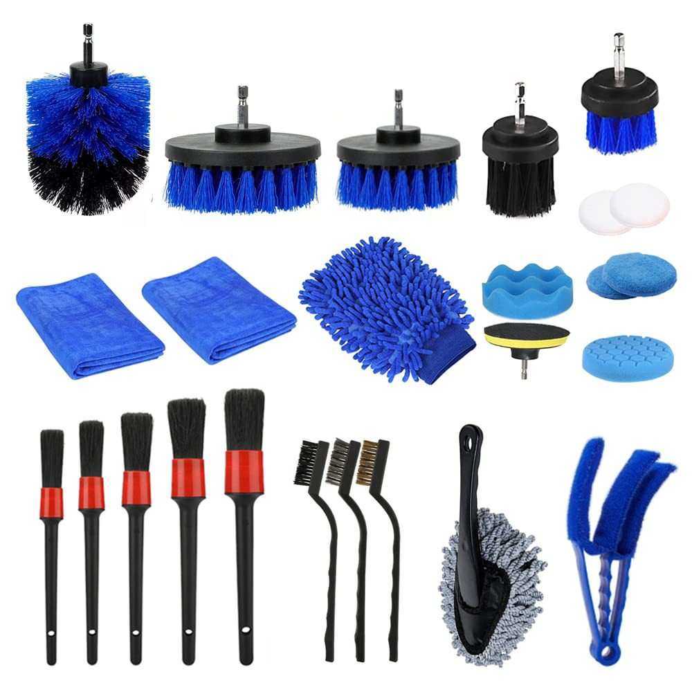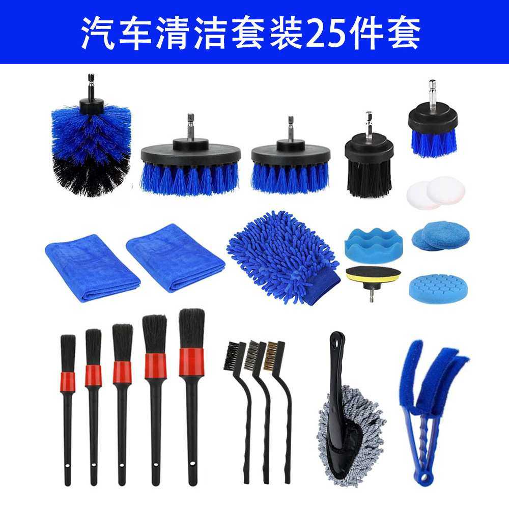 厂家货源蓝色汽车清洁套装25件洗车电钻刷打蜡海绵手套内饰清洗刷