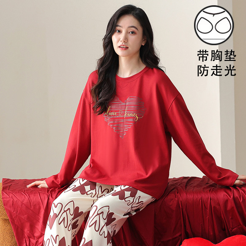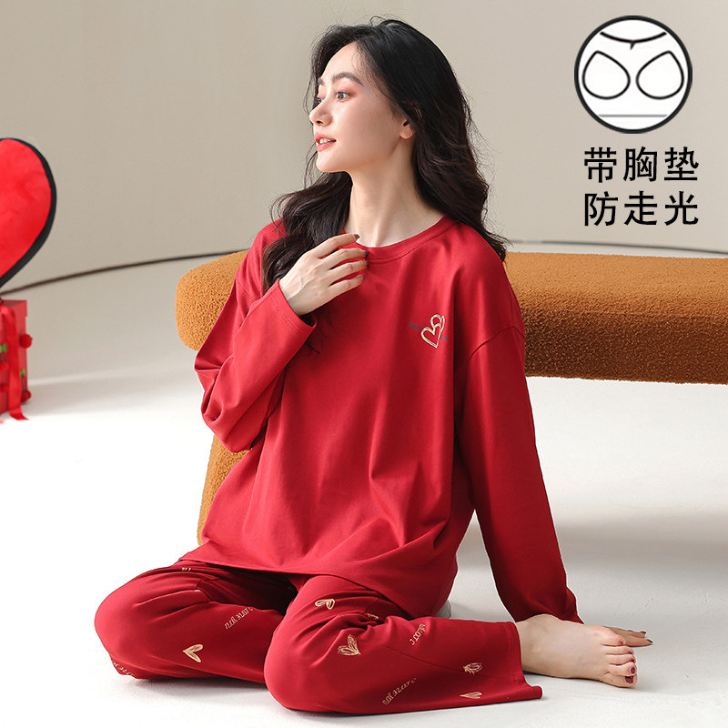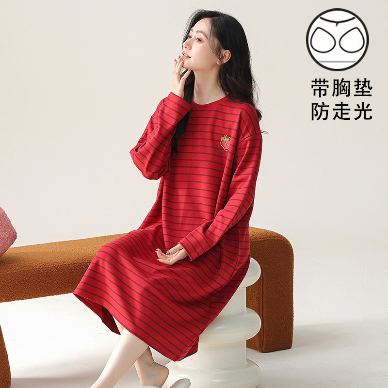 长袖睡裙女秋冬季红色薄款睡衣带胸垫一体宽松大码婚庆长裙可外穿