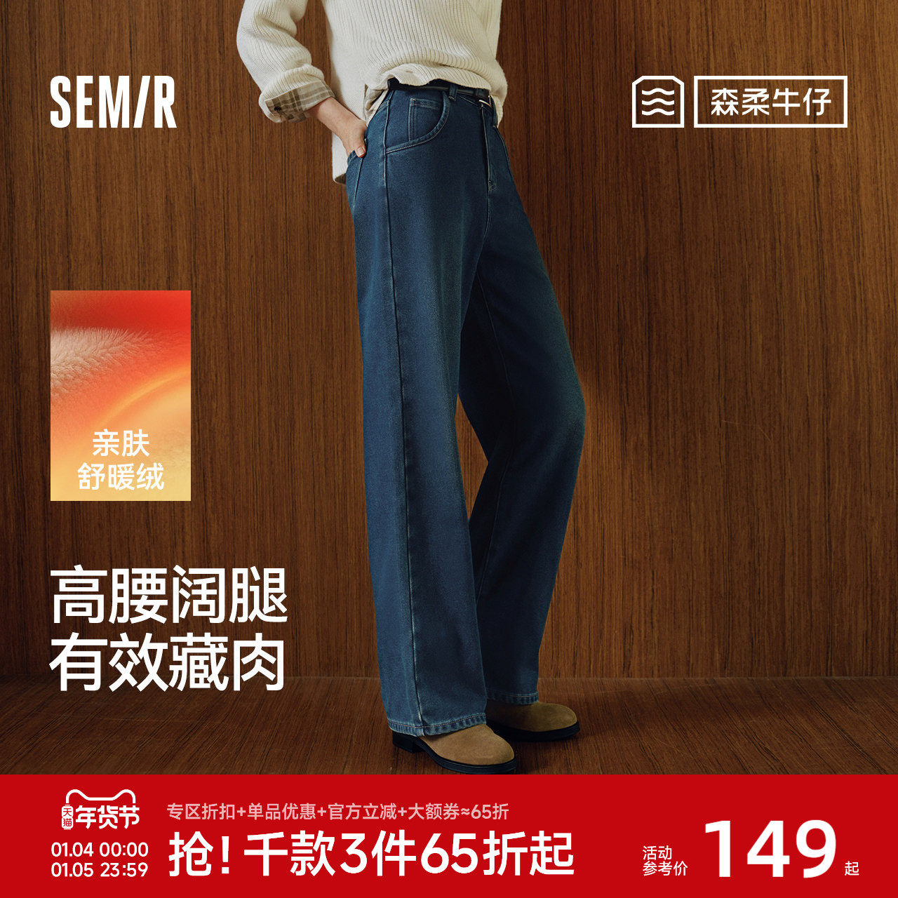 森柔|森马牛仔裤女冬摇粒绒保暖直筒裤高腰2025新款酷飒风拖地裤