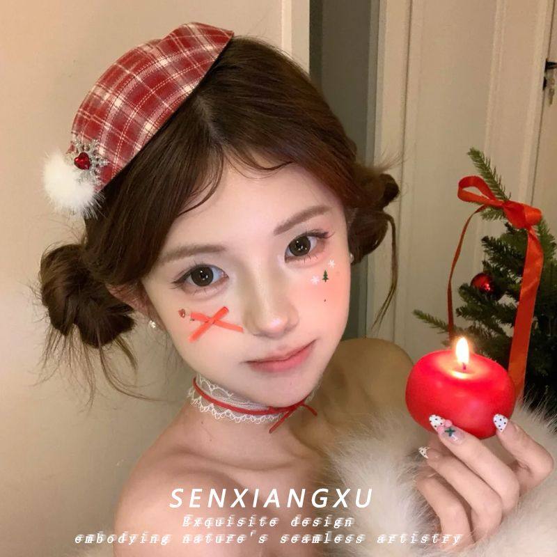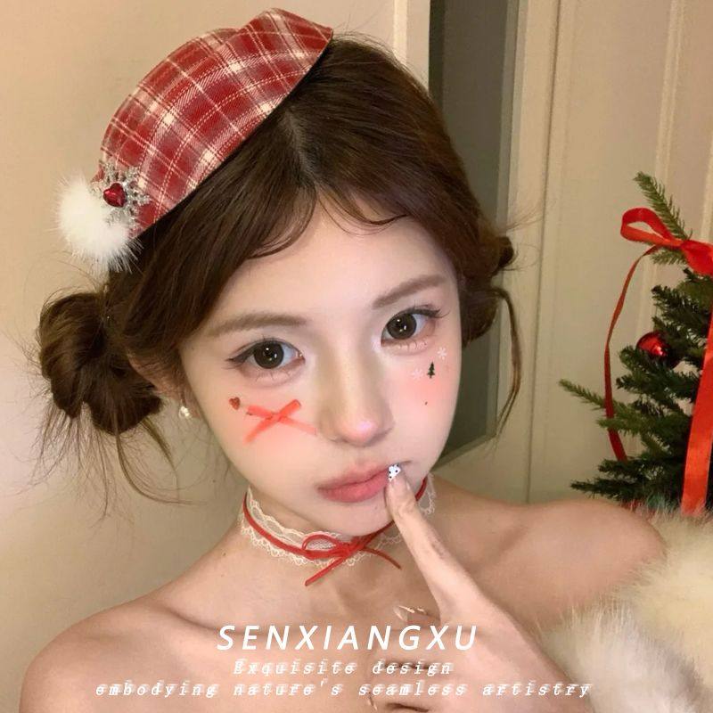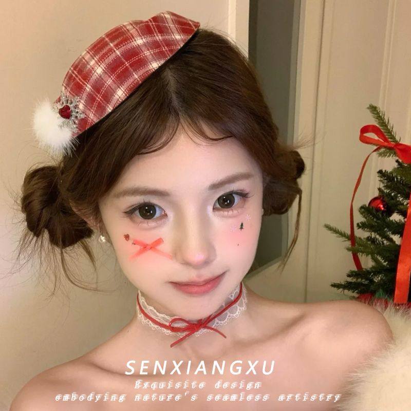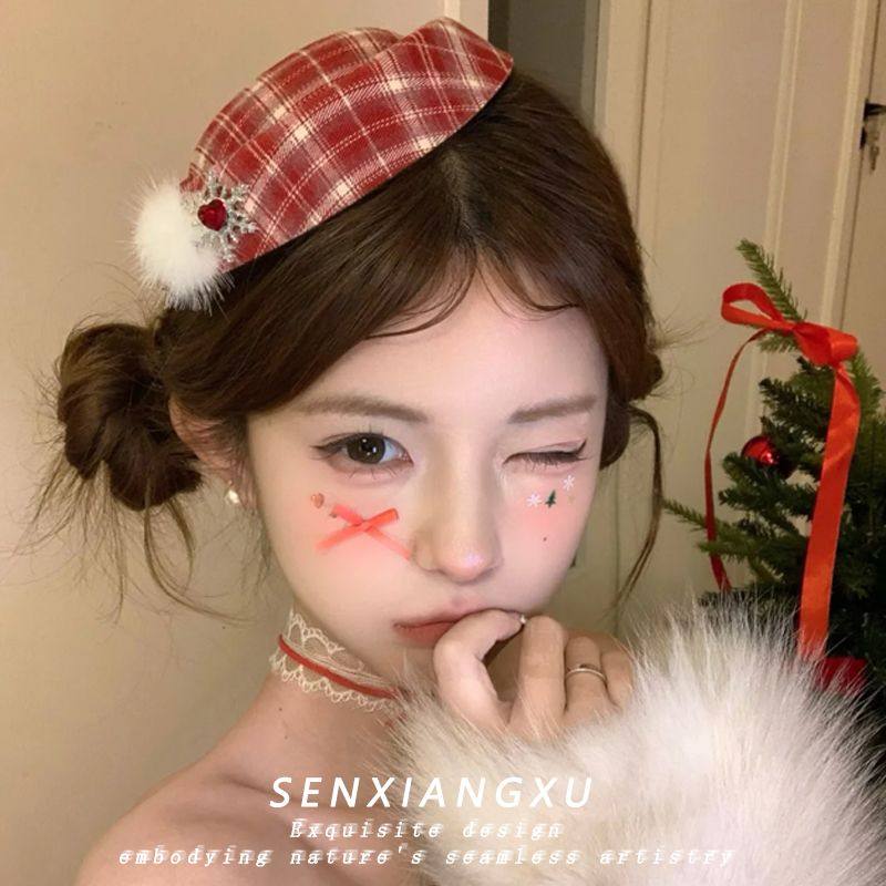 甜美红格雪花水貂毛球礼帽发夹圣诞氛围感贝雷帽发饰少女心头饰新