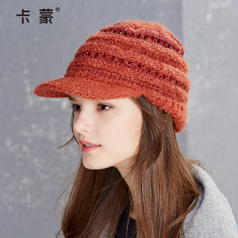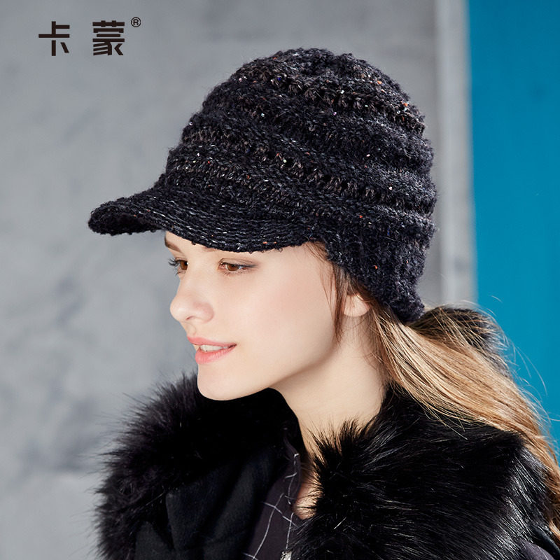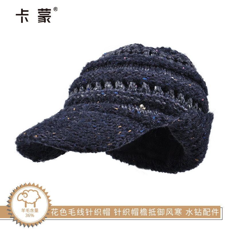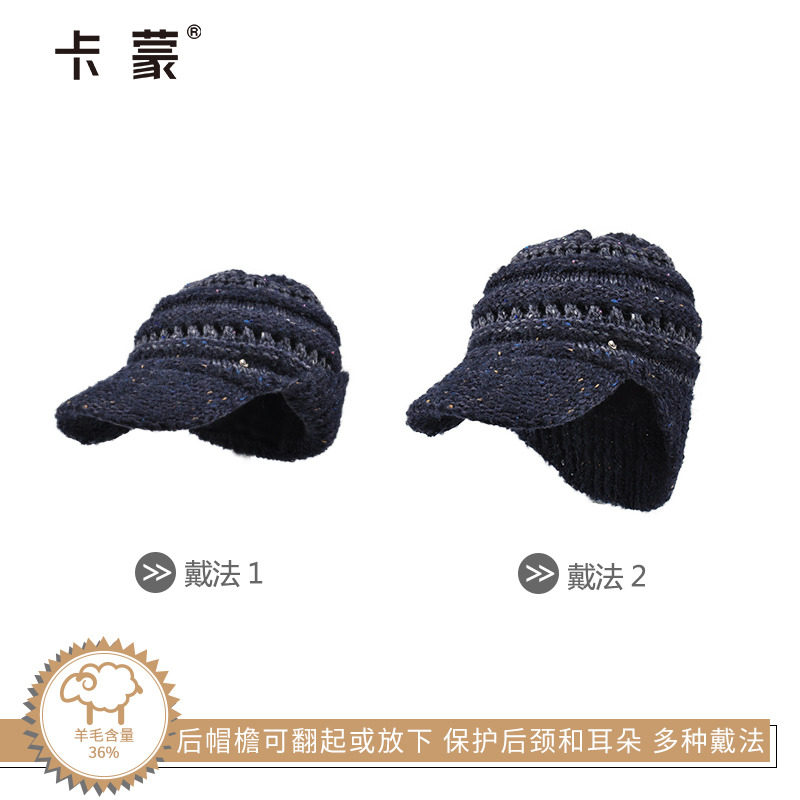 秋冬季保暖毛线帽带帽檐女士双层针织帽子羊驼毛混纺护耳朵防寒帽