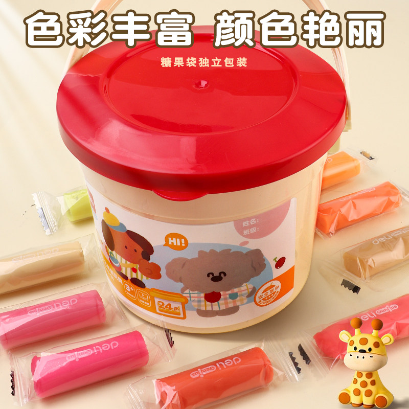 得力彩泥橡皮泥儿童幼儿园专用小学生diy手工12色桶装玩具套装安全24色黏土小学生专用超轻型粘土模具太空泥