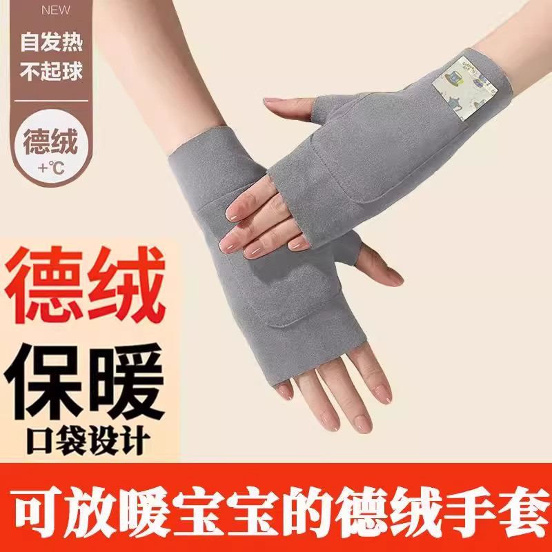 德绒手套男女秋冬保暖防寒自发热加绒半指学生写字护手套可放防冻