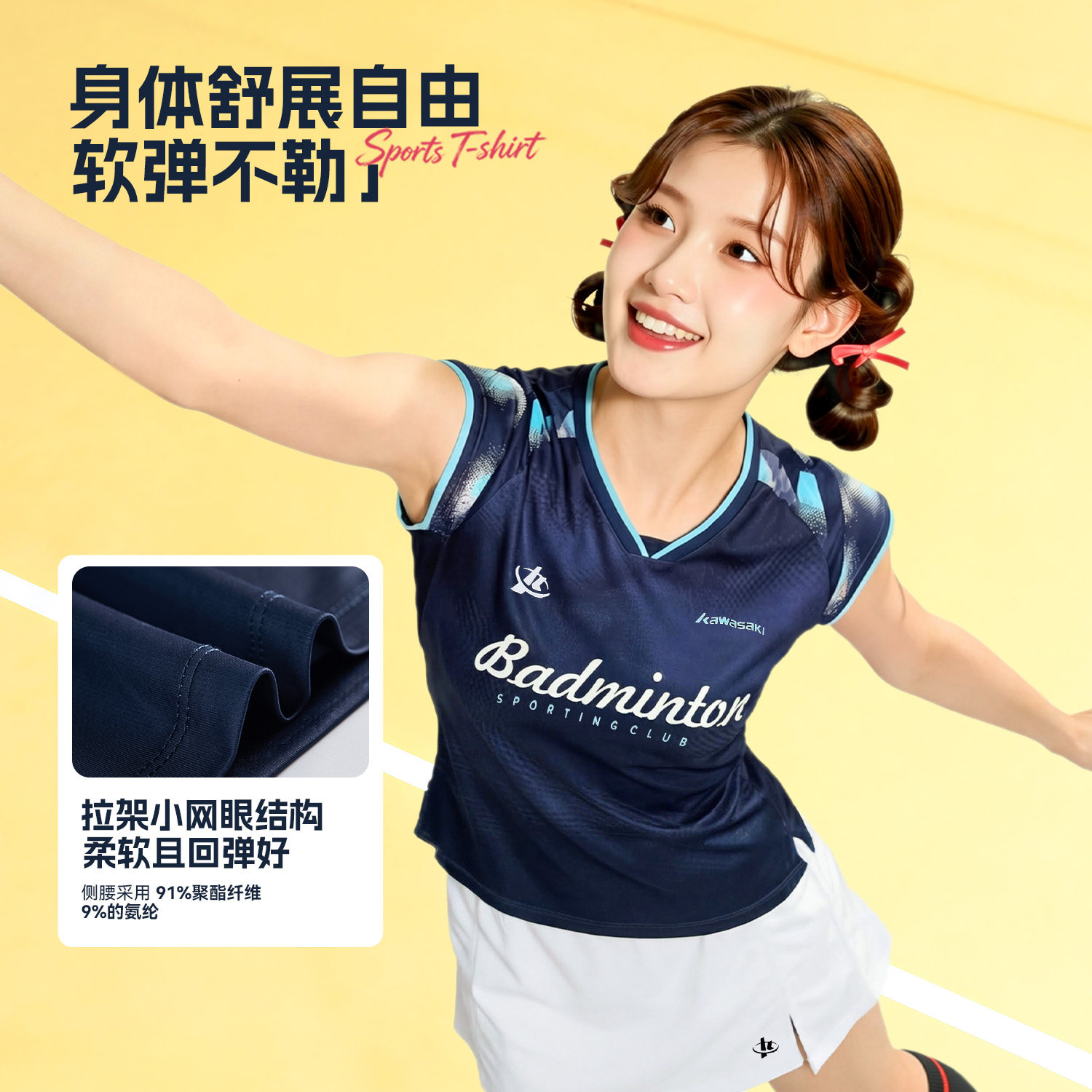 kawasaki川崎羽毛球服女运动短袖印花T恤上衣运动训练服透气修身