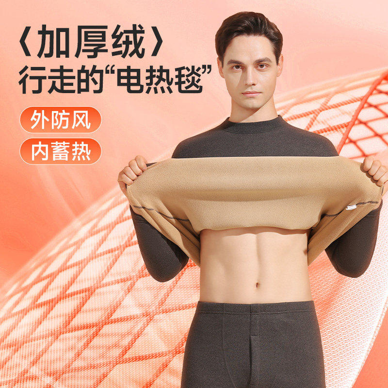 中高领保暖内衣男士加绒加厚套装大码德暖绒秋衣秋裤打底棉毛衫冬