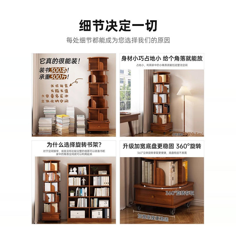 实木旋转书架360度书柜置物架落地一体靠墙可移动转角儿童小窄柜