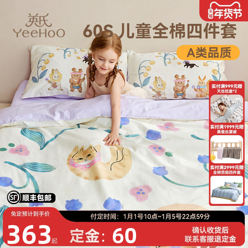 英氏儿童四件套纯棉床上用品贡缎被套三件套床品被套田园猫咪