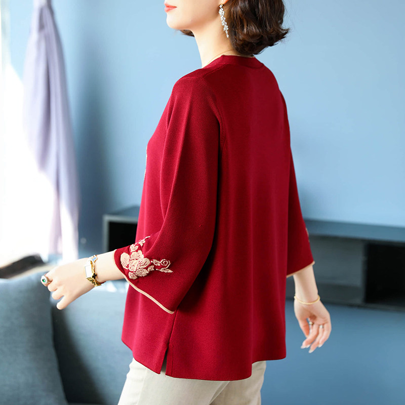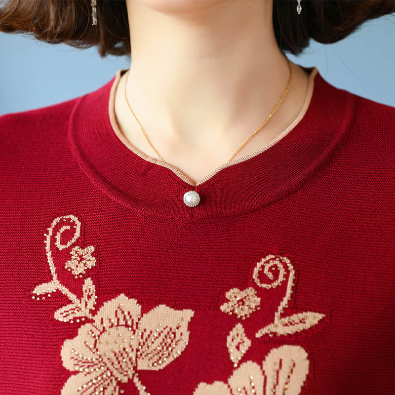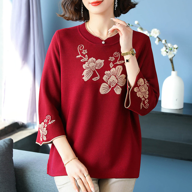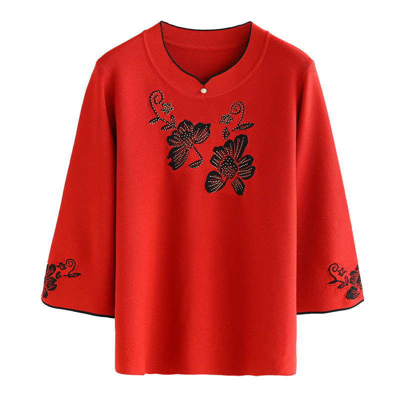 恒源祥2025妈妈春装毛衣红色上衣中老年人女打底衫衣服圆领针织衫