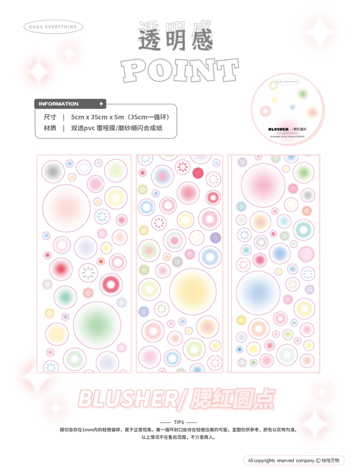 (现货)透明感基础双透模切贴纸卷咕咕万物原创手帐咕卡腮红圆点