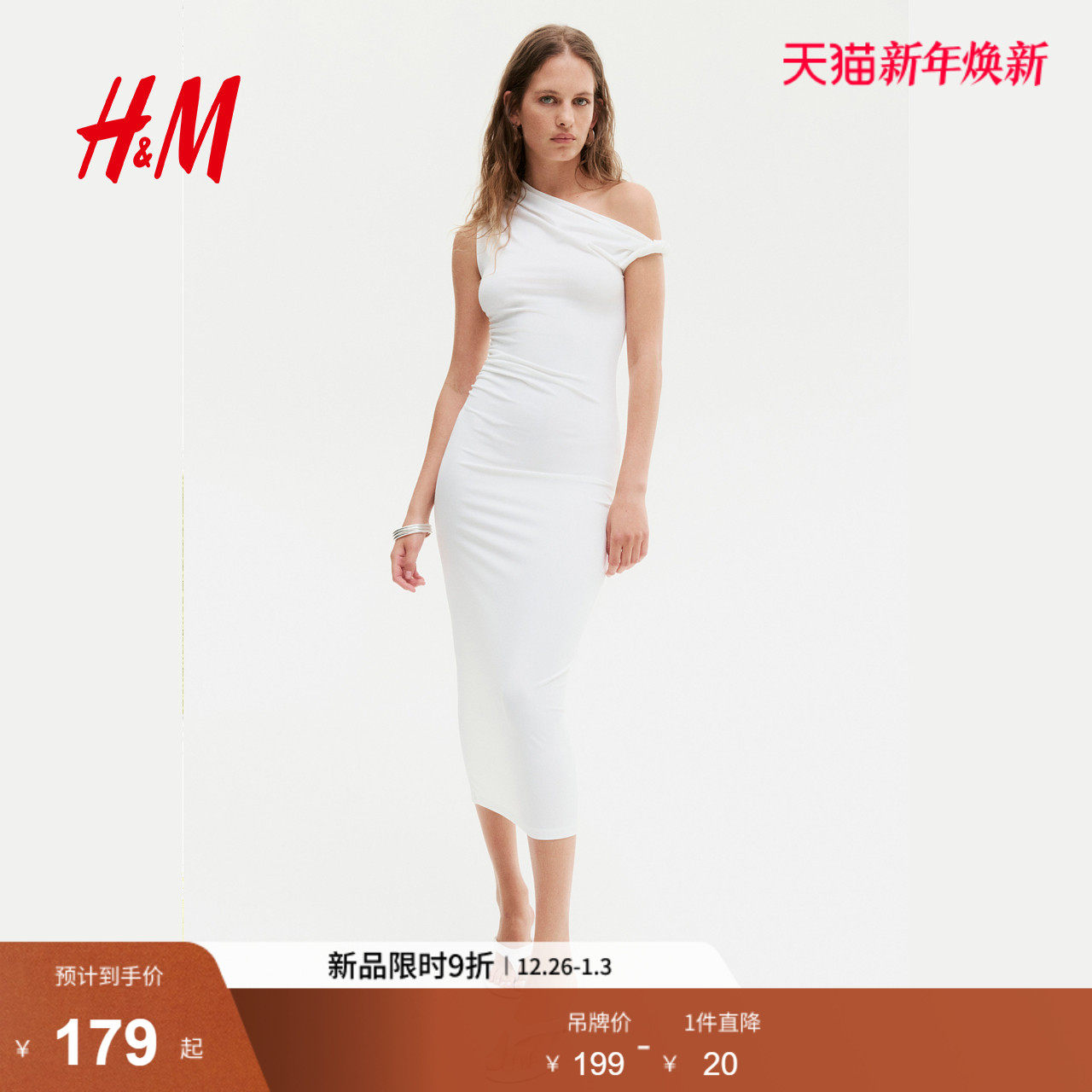 HM女装连衣裙2025冬季斜肩型修身收腰扭结单肩礼服裙1265423