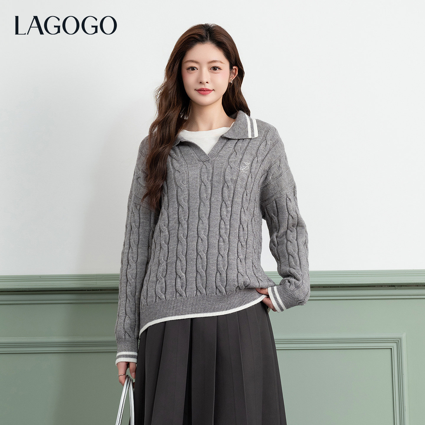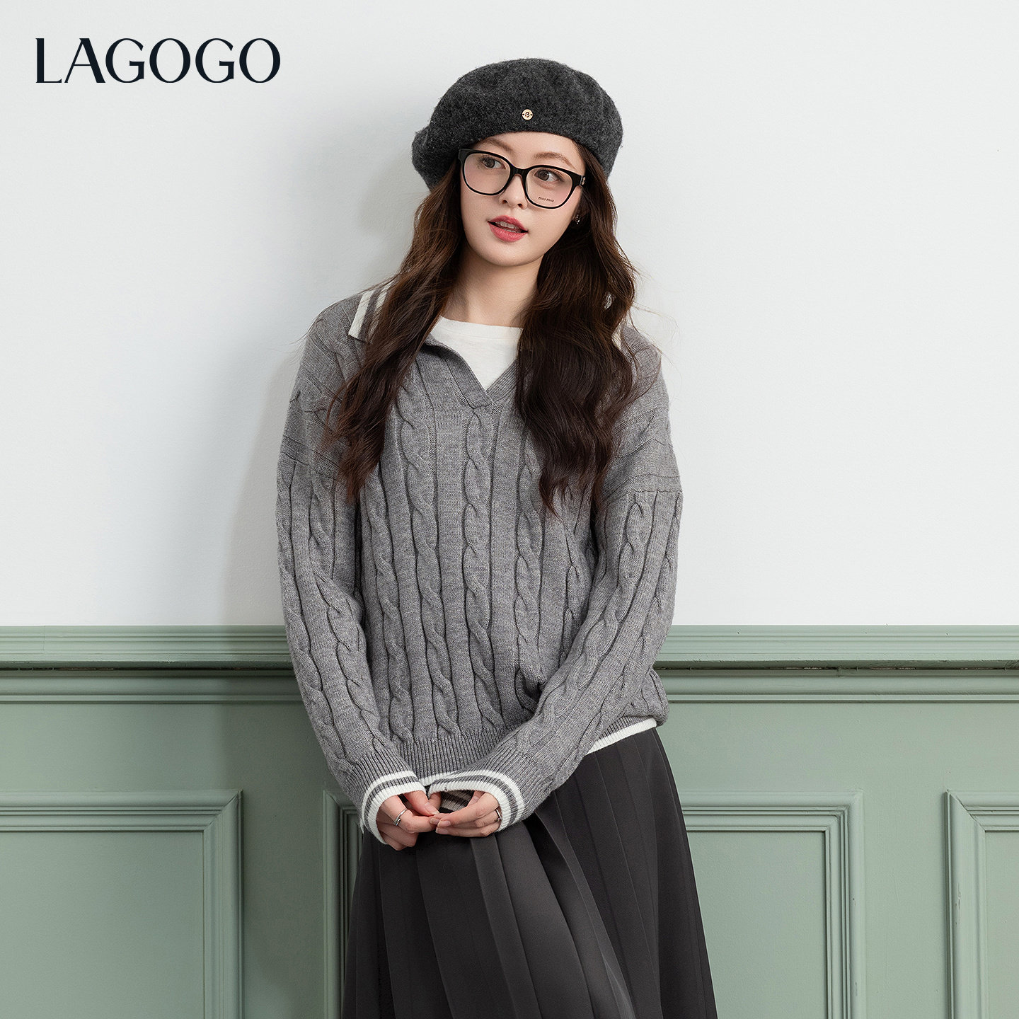LAGOGO学院风麻花灰色针织衫女拉谷谷2026春新款V领软糯宽松毛衣