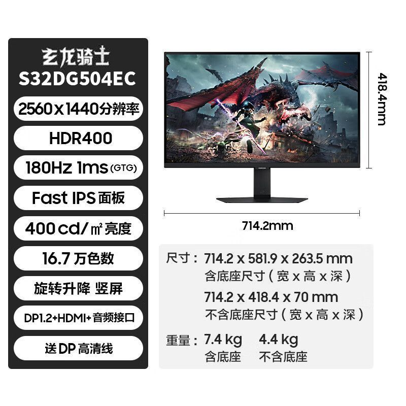 三星32英寸2K/180Hz电竞显示器S32DG500EC 27英寸游戏IPS屏幕 190