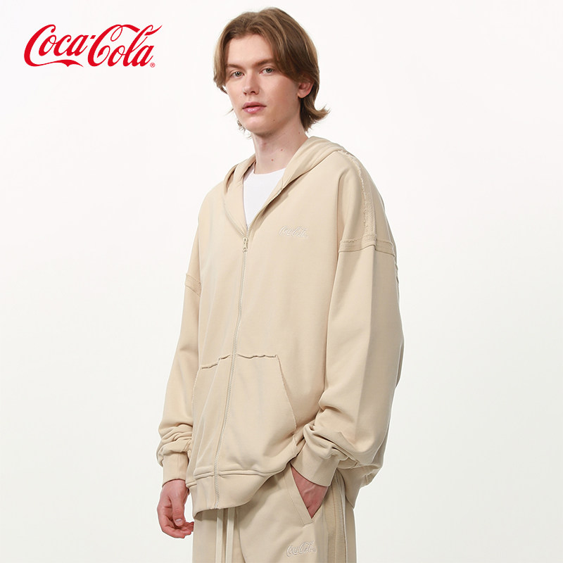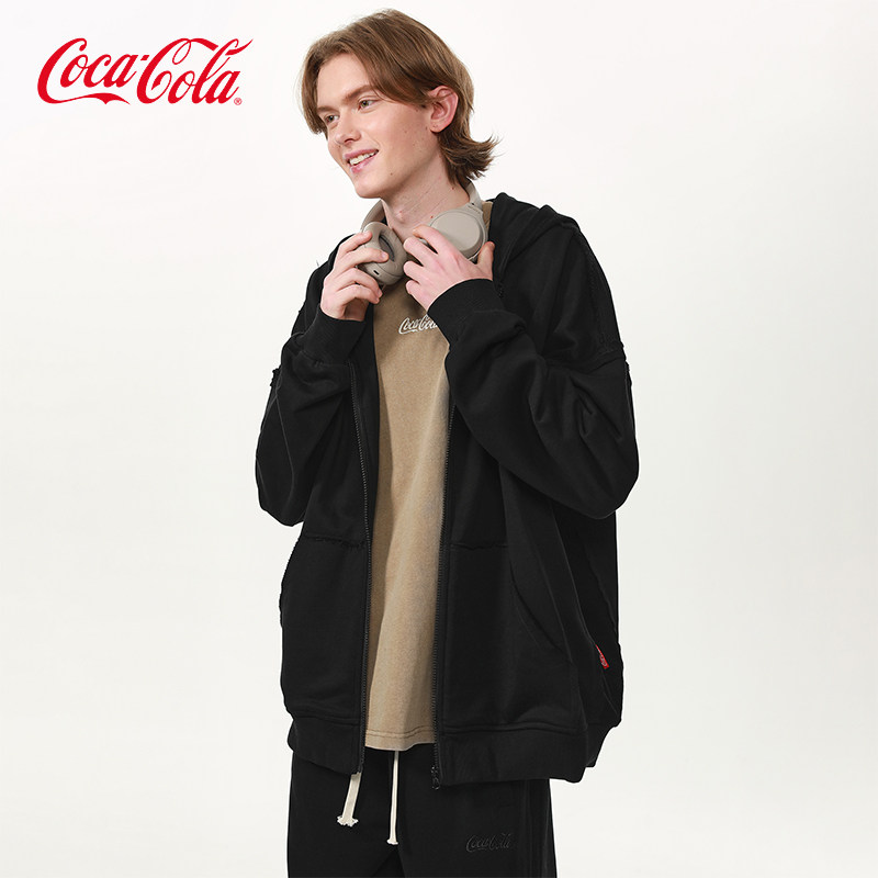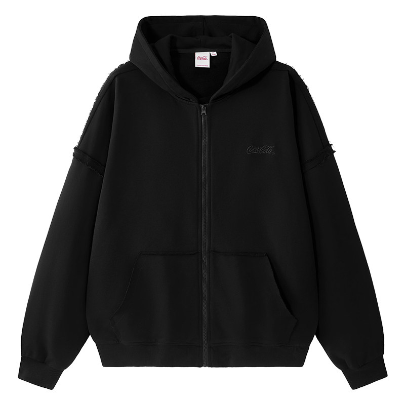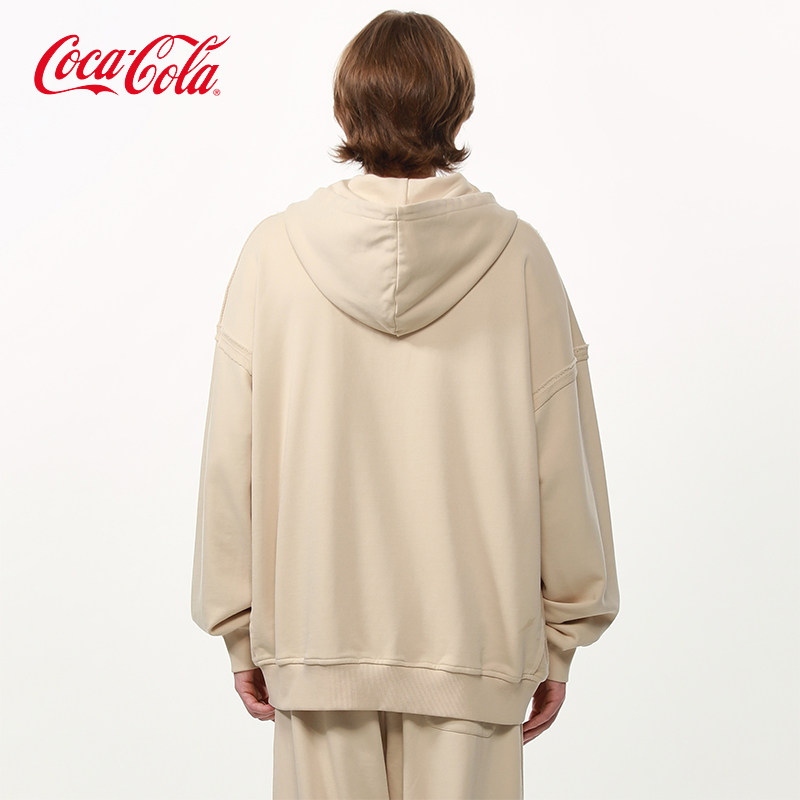 Coca-Cola/可口可乐 毛圈散边拼接水洗字母刺绣连帽开衫外套卫衣