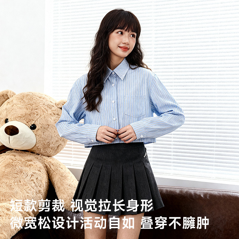 唐狮蓝色翻领衬衫女2026新款春秋款小个子短款翻领设计感上衣女VB