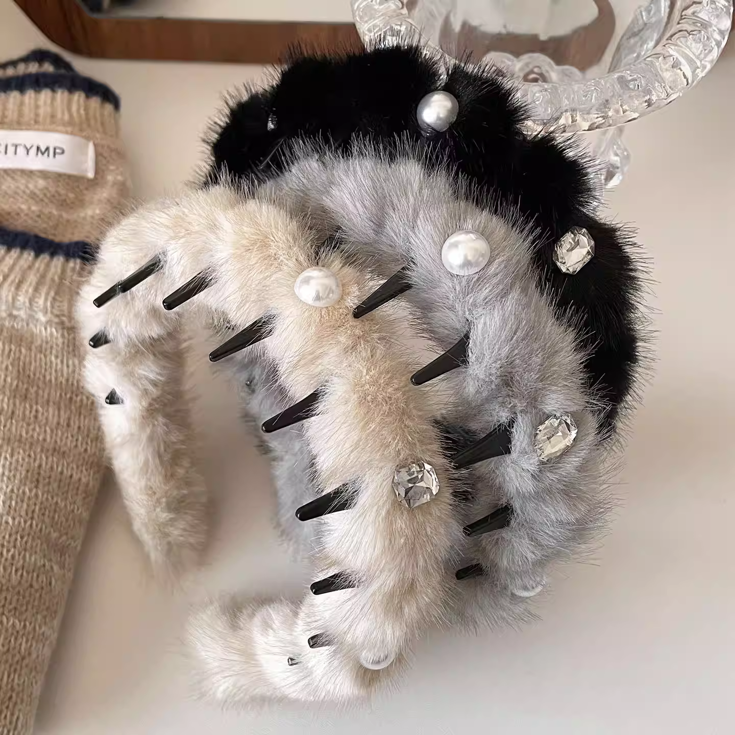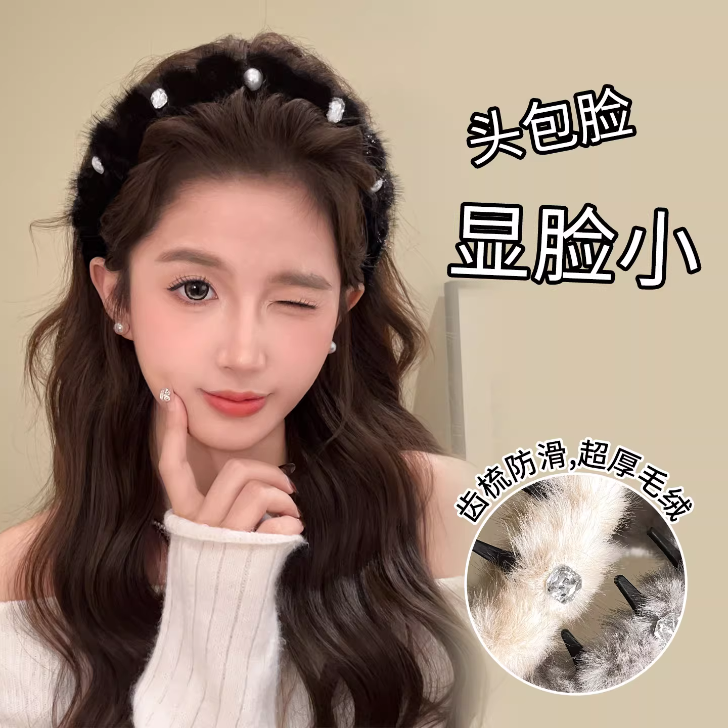 2026年新款秋冬毛绒发箍女带齿洗脸头箍高颅顶珠珠装饰发卡高级感