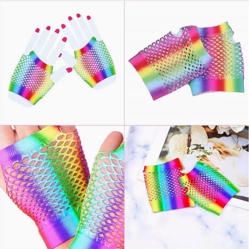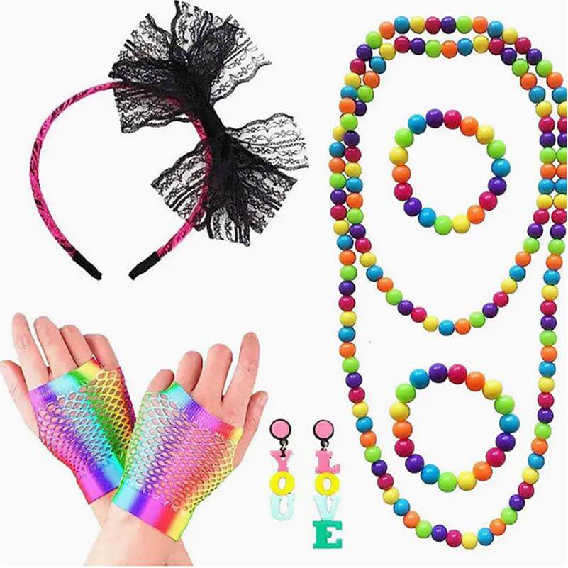 新款80s派对服装配饰紫色蝴蝶结蕾丝发箍彩色耳环渔网手套套装
