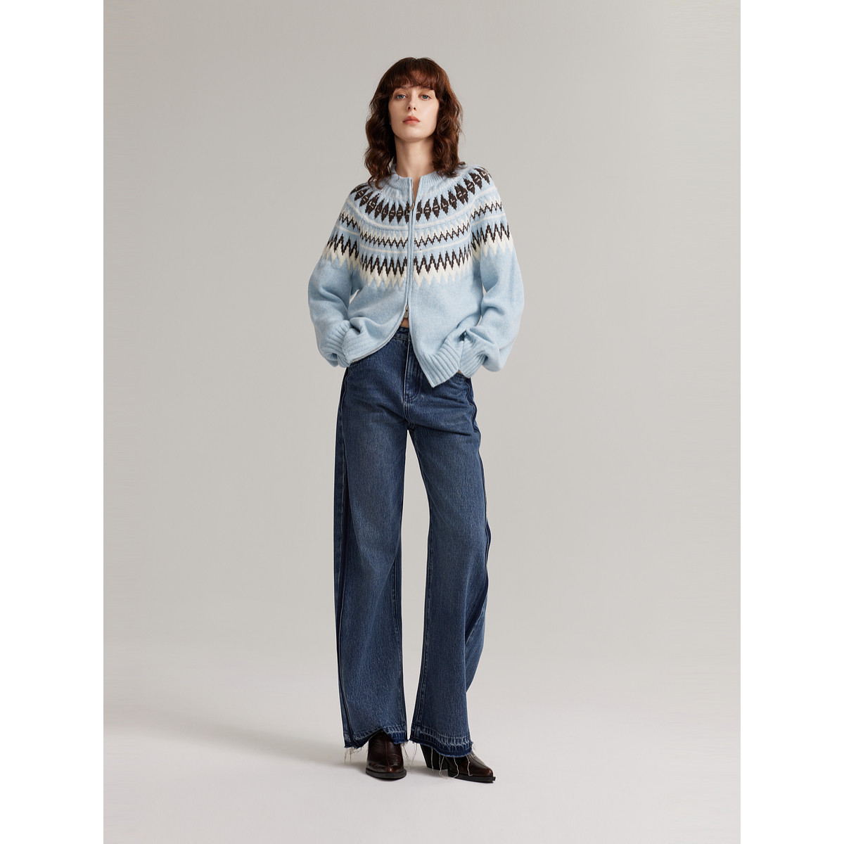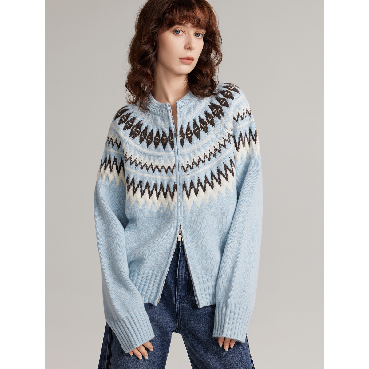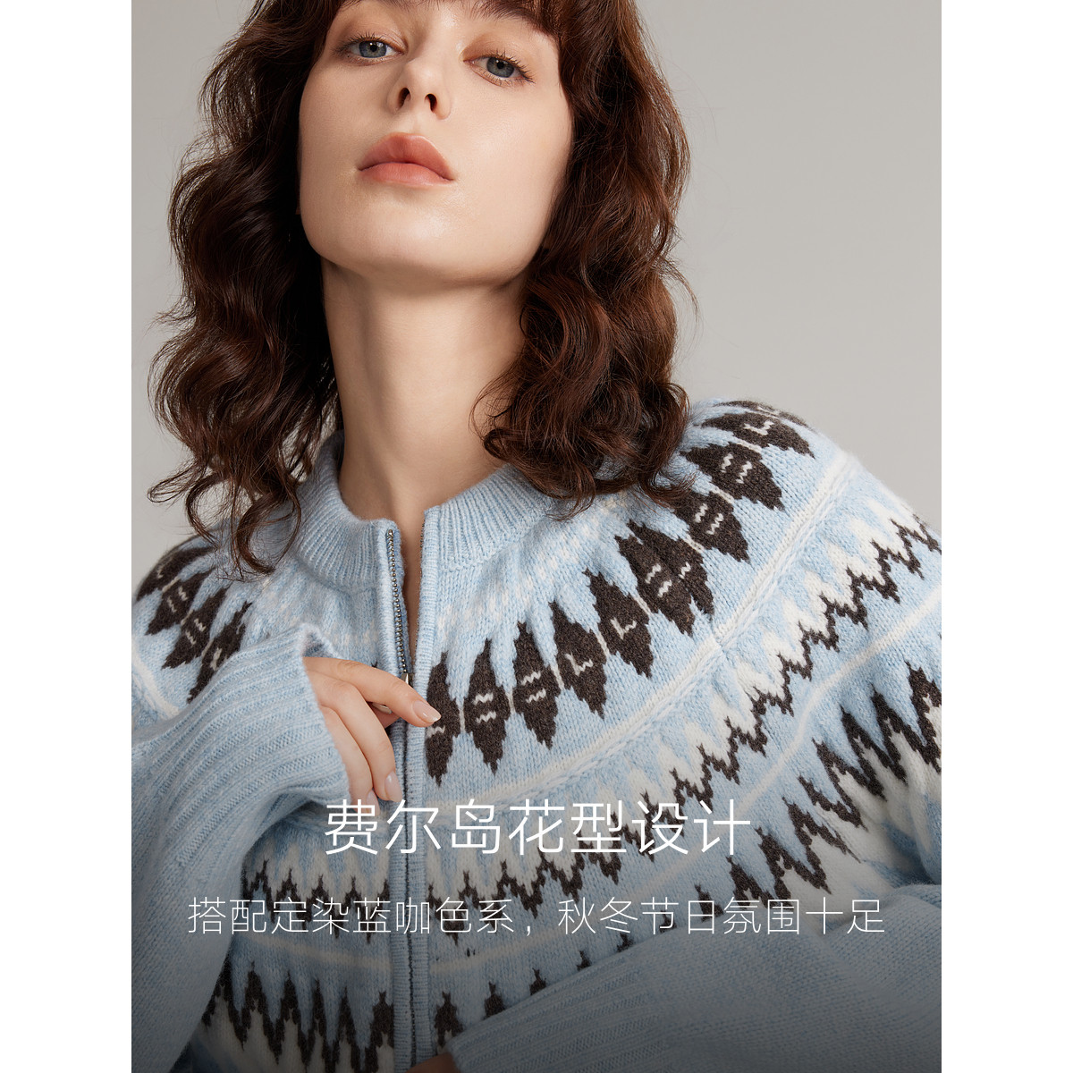【100%绵羊毛】ELLE费尔岛花型拉链毛衣女2025冬季新款针织开衫