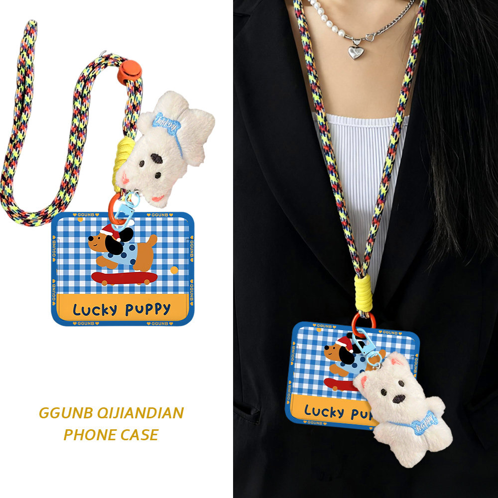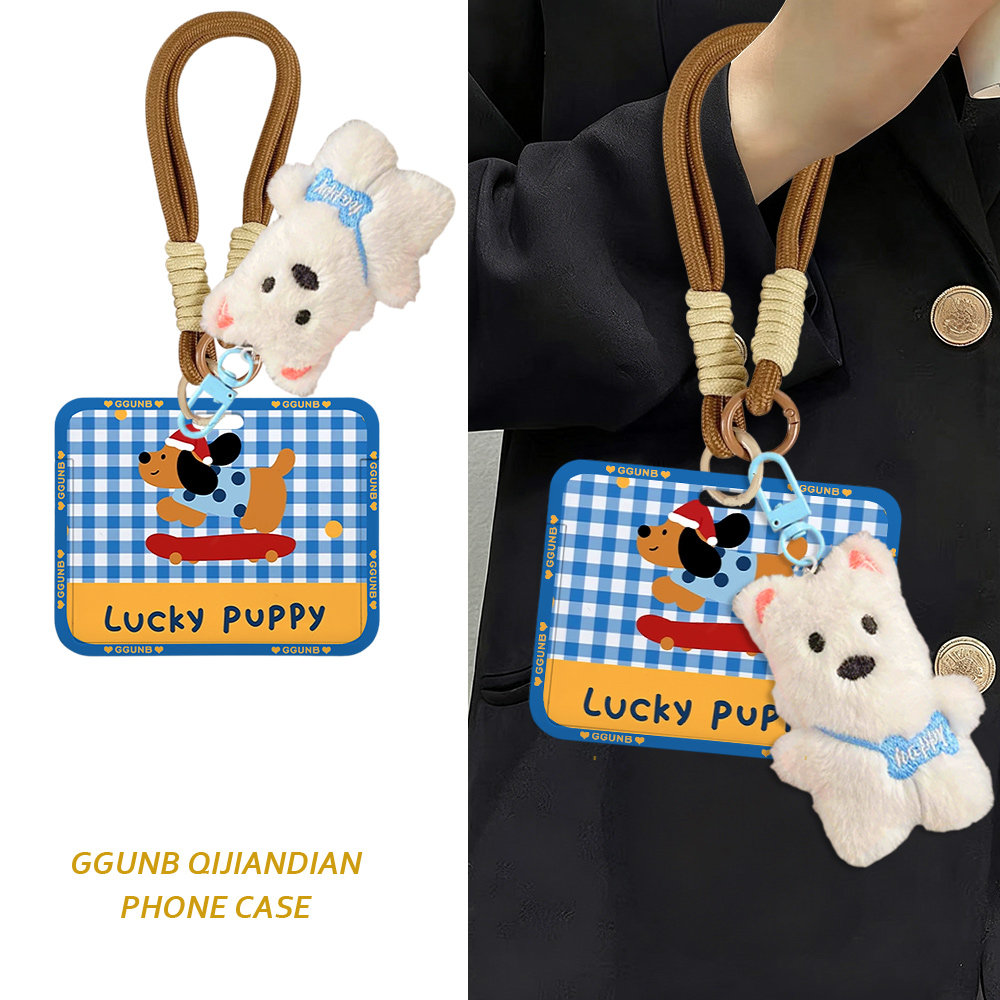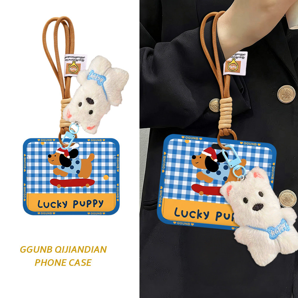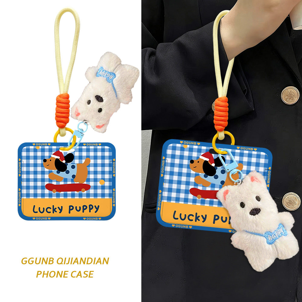 蓝白格纹溜滑板puppy棕狗卡套学生滑盖卡套饭卡地铁电瓶车小区卡包学生卡公交卡身份证件门禁卡工作证件套