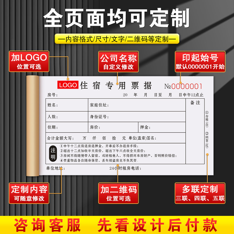 【住宿专用】酒店住宿登记本宾馆旅客预定押金收据表旅馆入住订房水单宾客消费清单费用报销单客房开票开单本