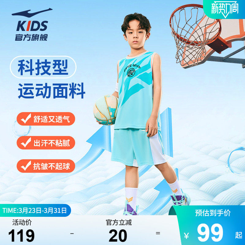 鸿星尔克童装儿童篮球服夏季速干男童训练运动服套装大童背心短裤