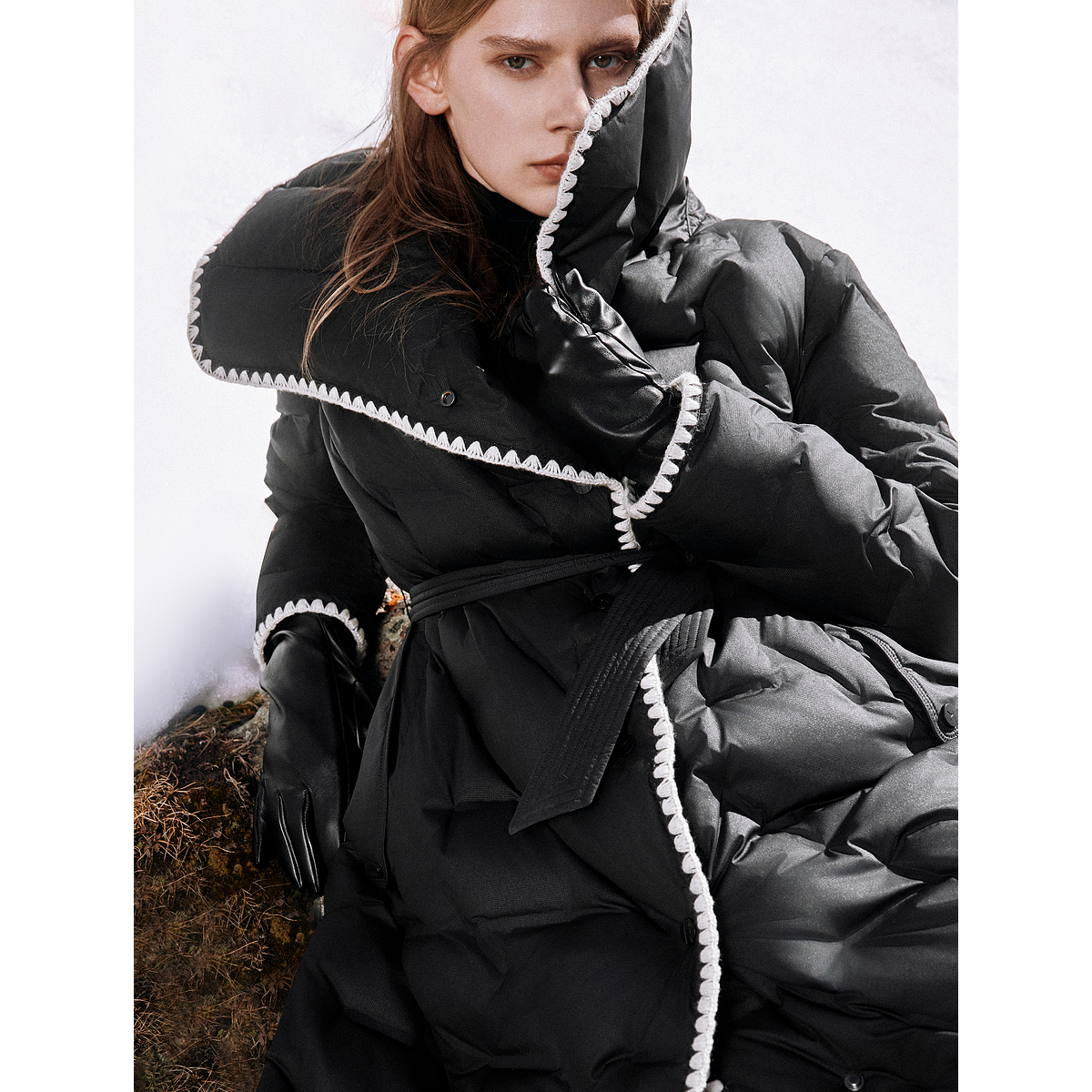 ELLE90白鸭绒黑色贝壳绣长款羽绒服女2025冬季新款高级感保暖外套