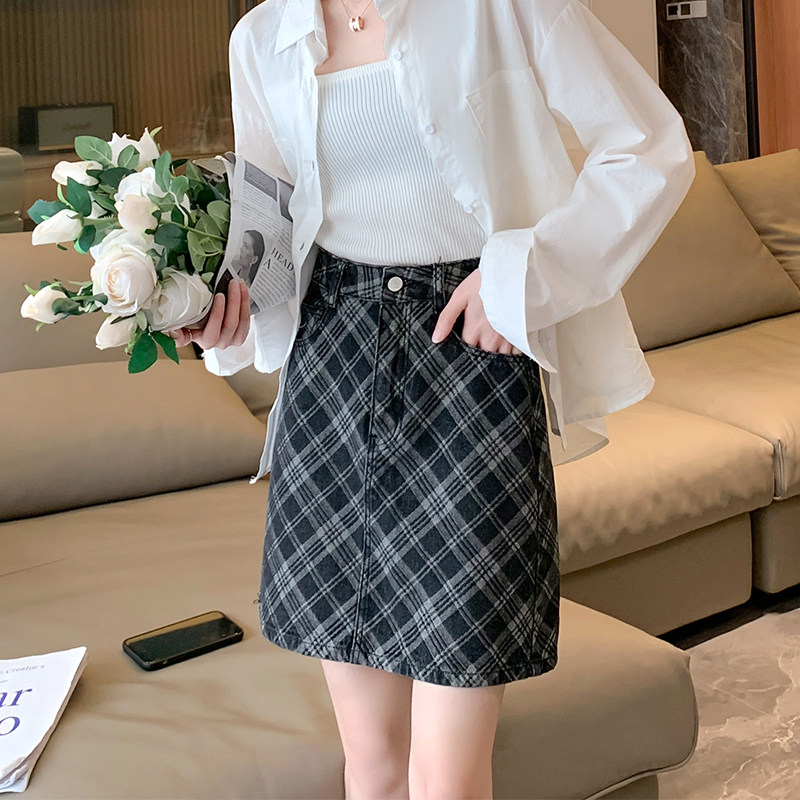 唐狮半身裙女小个子夏季菱形高腰牛仔a字裙显瘦提花格纹牛