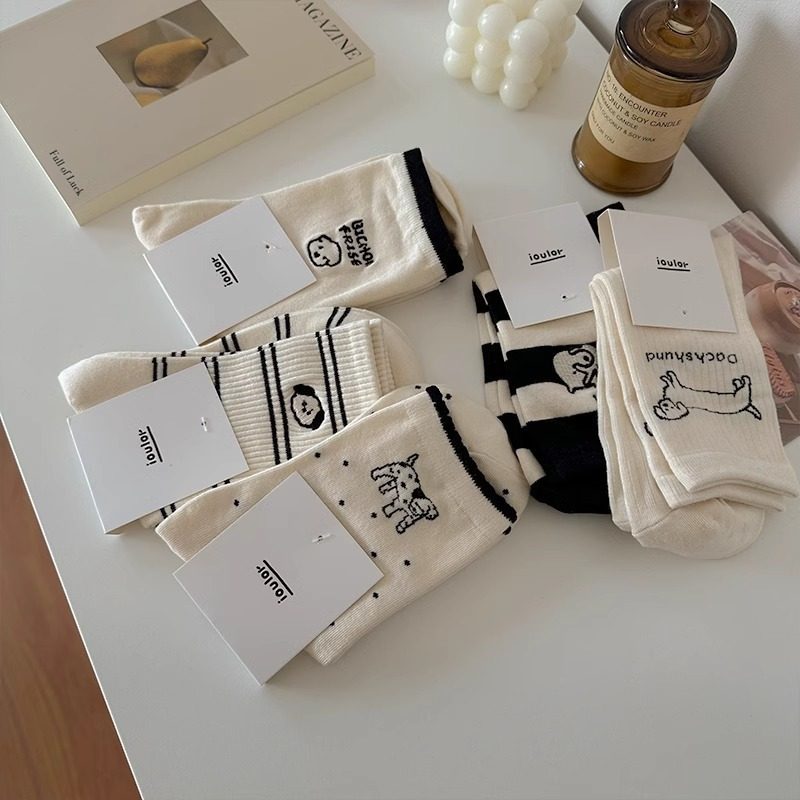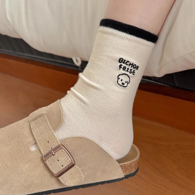 日系袜子碎花秋冬季卡通小狗中女士筒棉袜可爱简约百搭潮袜中筒