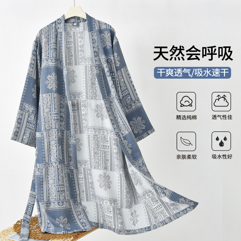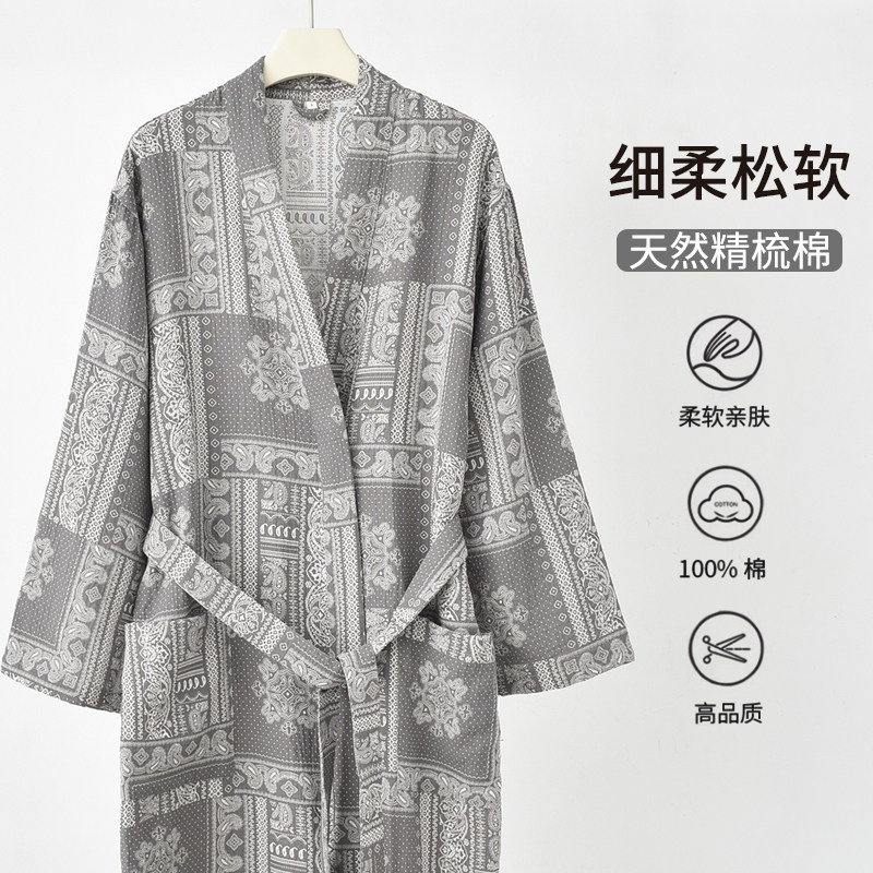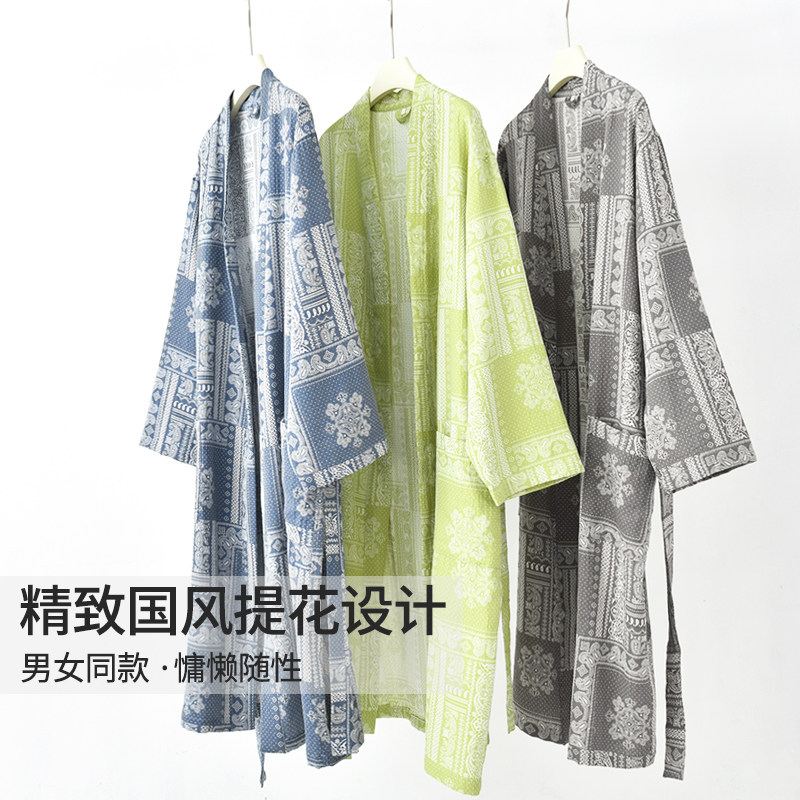 如奕春夏新款浴袍纯棉双层纱布提花成人家用浴衣睡袍宽松复古情侣