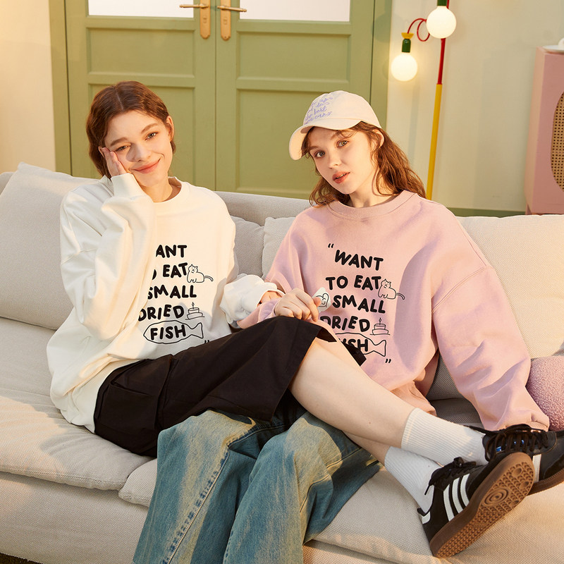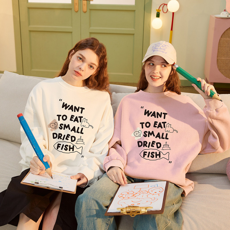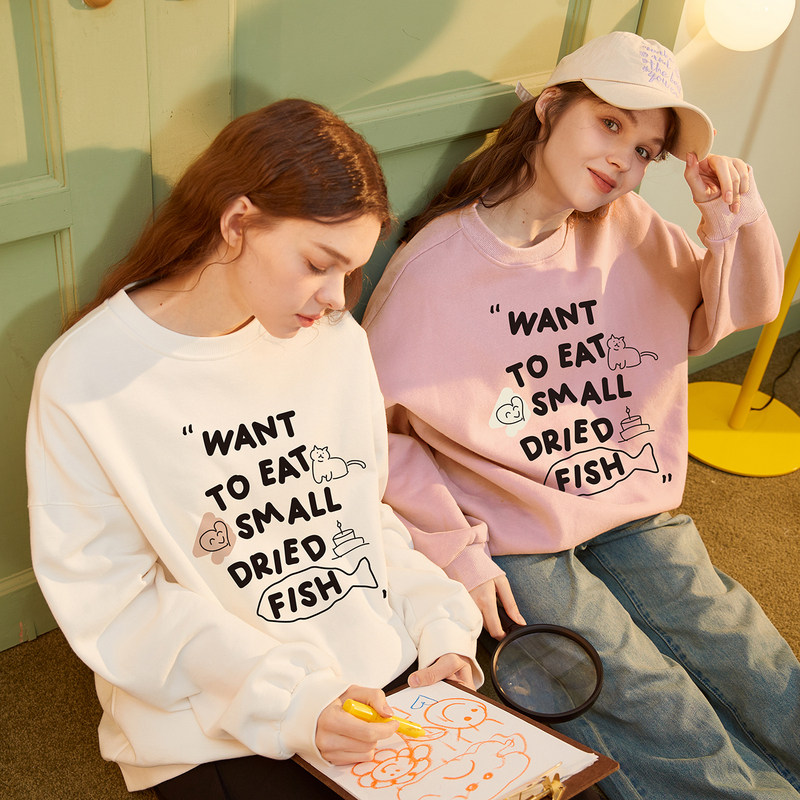 唐狮女装趣味印花加绒套头卫衣秋季新慵懒感绒衫衣服漂亮卫衣