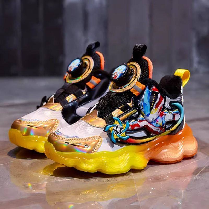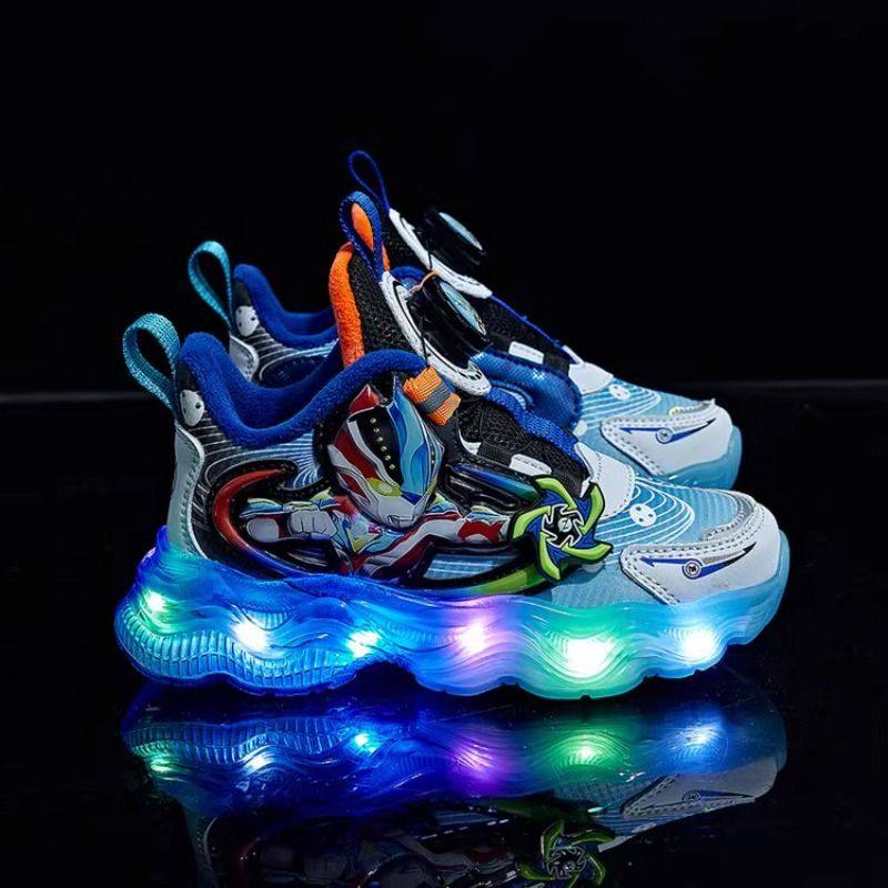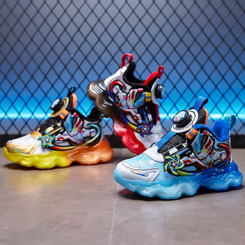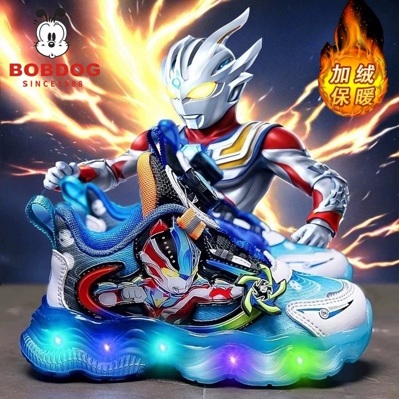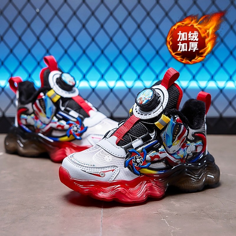 巴布豆真皮曼男童新款发光鞋旋转扣运动鞋儿童加绒鞋子亮灯防滑