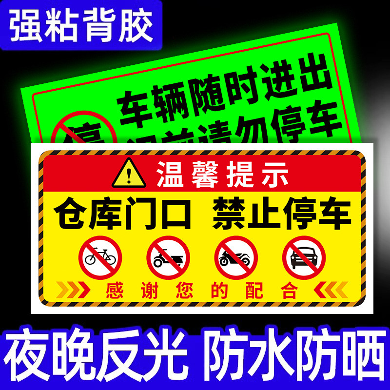 禁止停车警示牌夜光仓库门前禁止停车店铺门前请勿停车警示牌反光贴纸内有车辆随时出入车库卷帘门温馨提示牌
