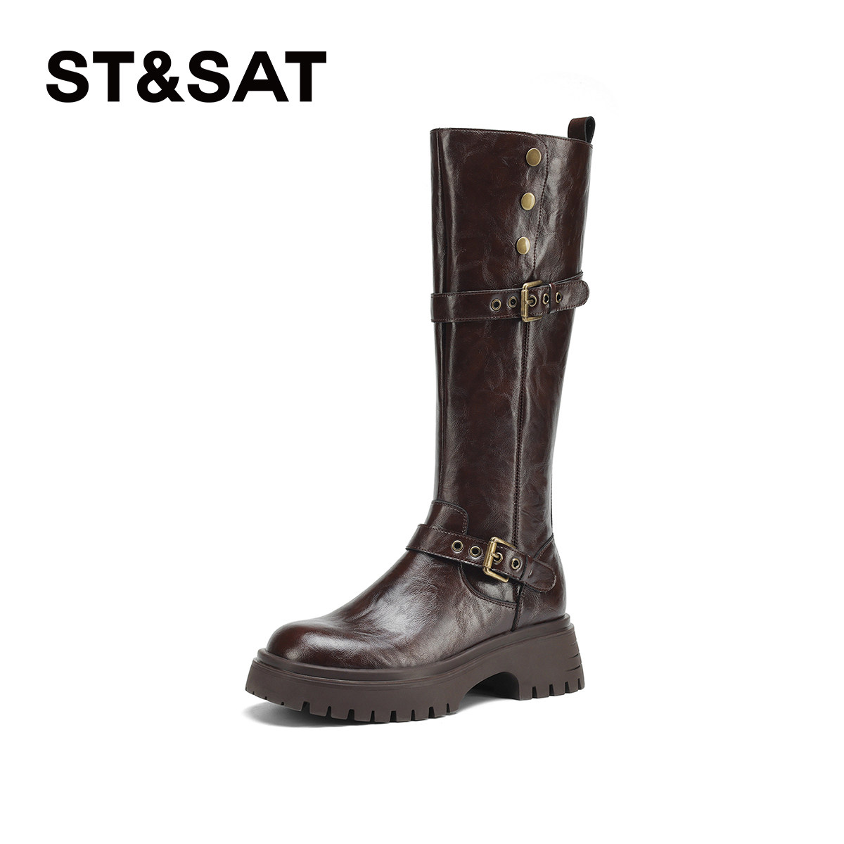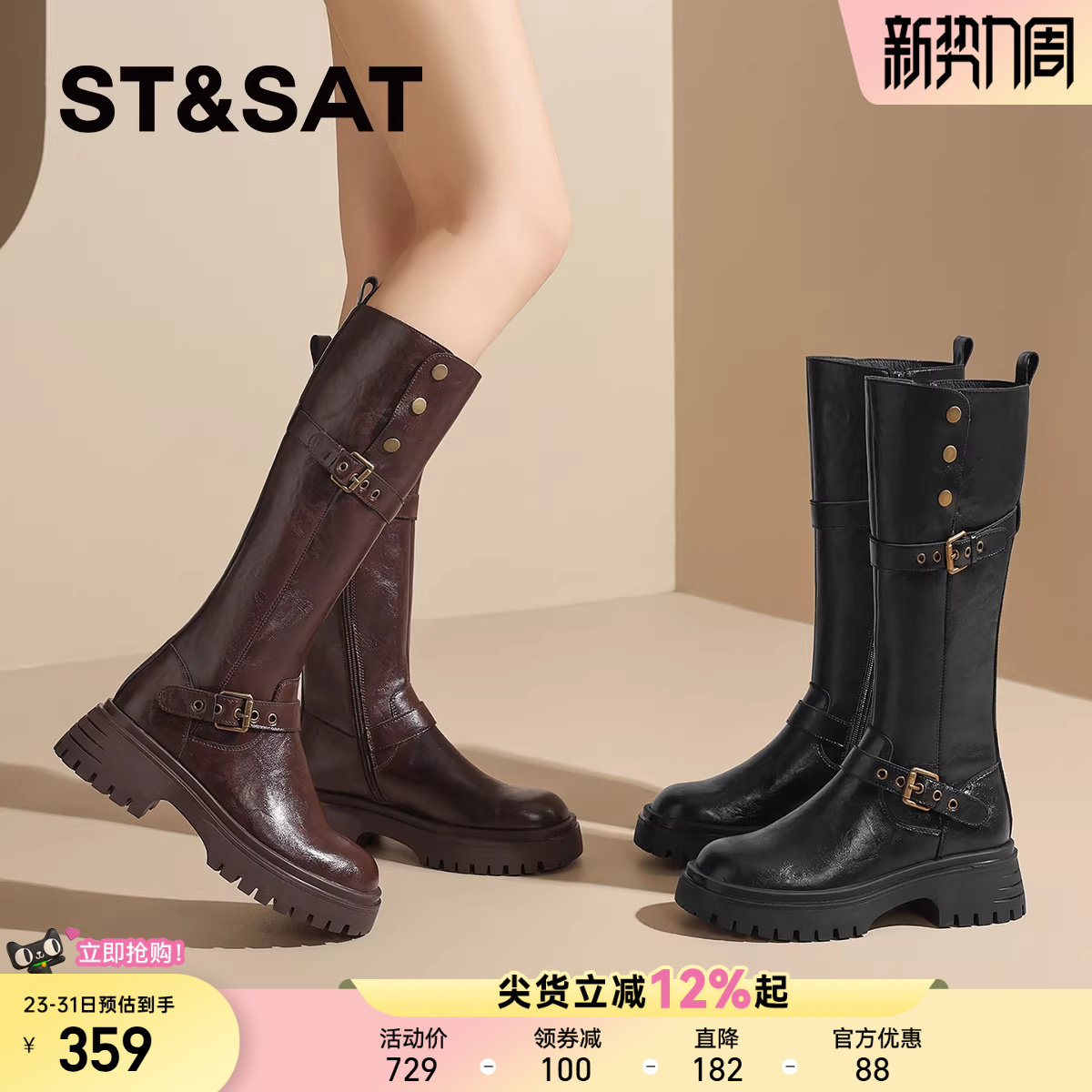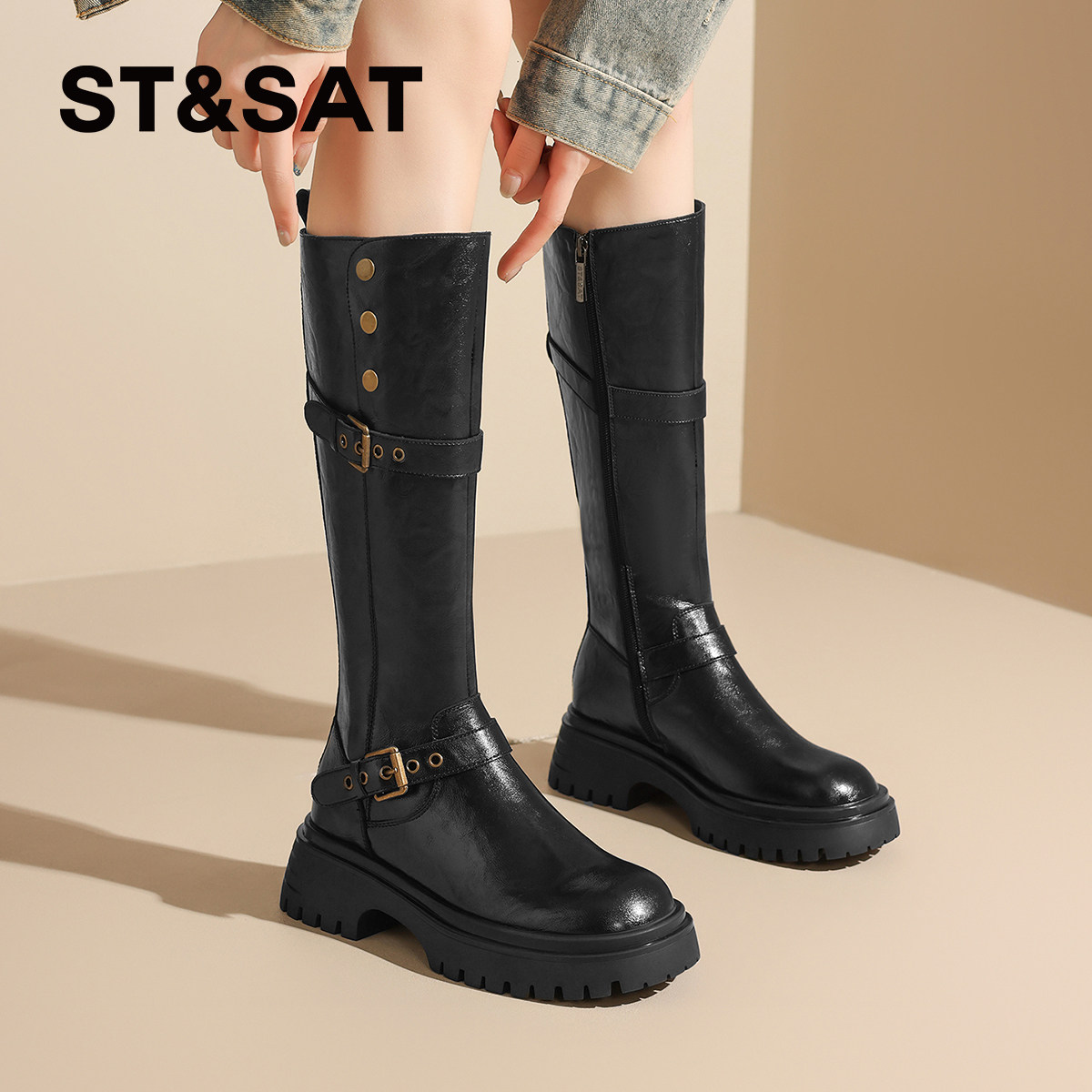 星期六两穿皮带扣机车靴女靴子2025新款秋季西部厚底骑士靴长筒靴