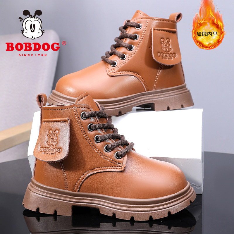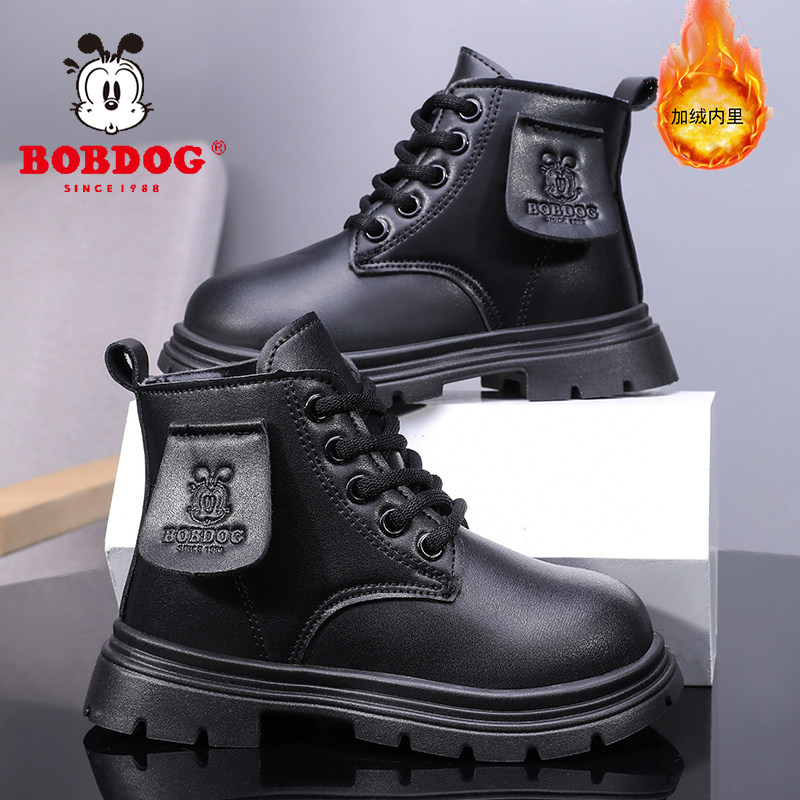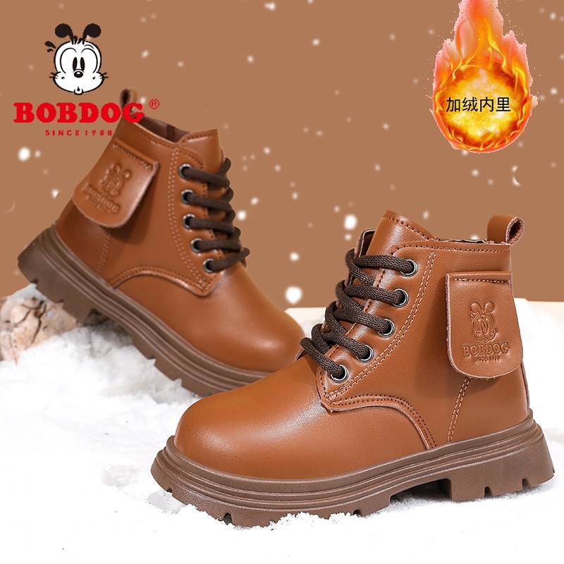 巴布豆男童马丁靴加绒保暖2025冬季新款皮面防水儿童棉鞋小中大童