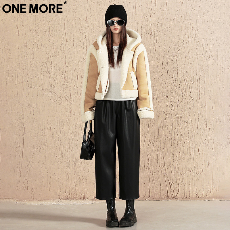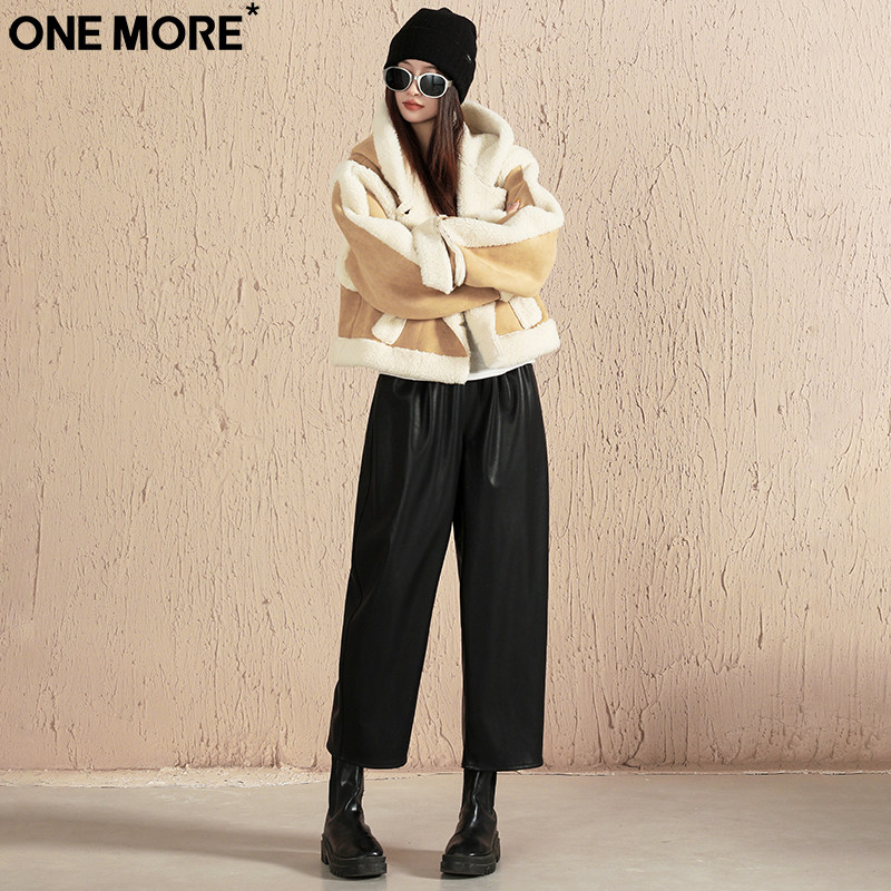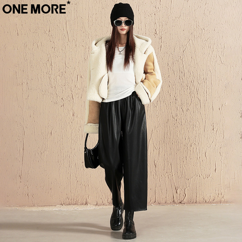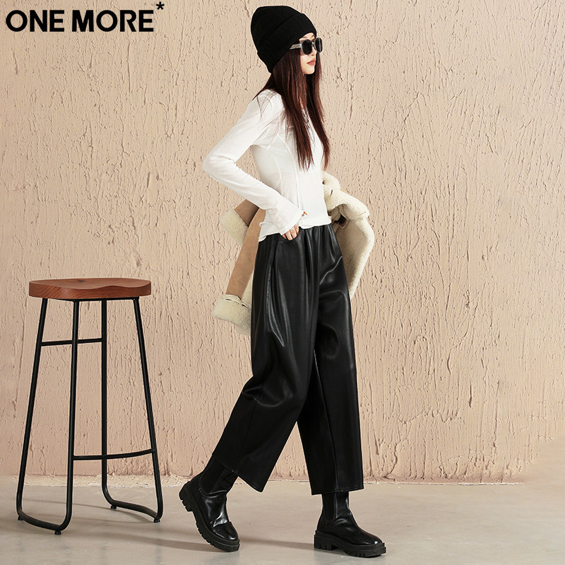 One More老钱风黑色休闲皮裤女秋冬季新款直筒宽松阔腿小个烟管裤