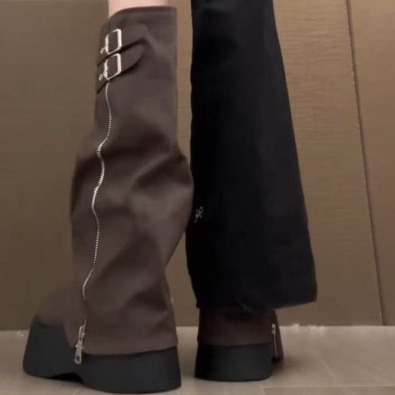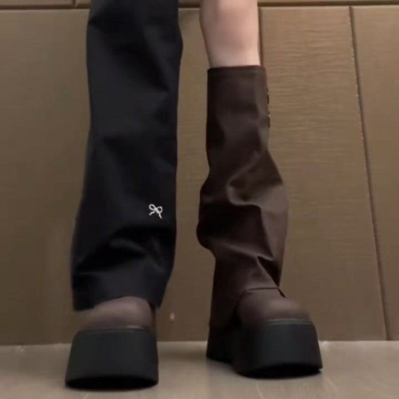 女厚底长筒靴褶皱长靴2025高筒靴新款裤管小个子春秋棕色黑色圆头