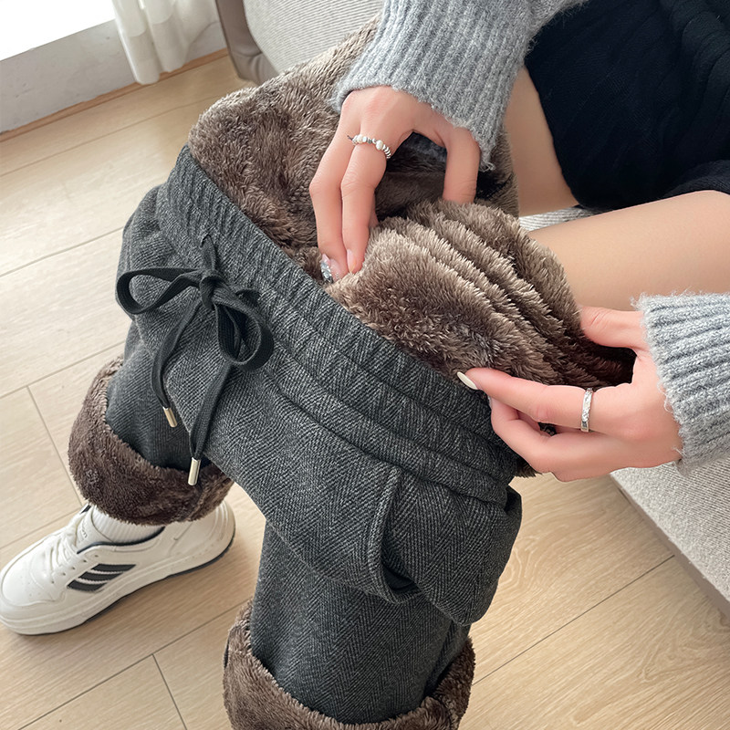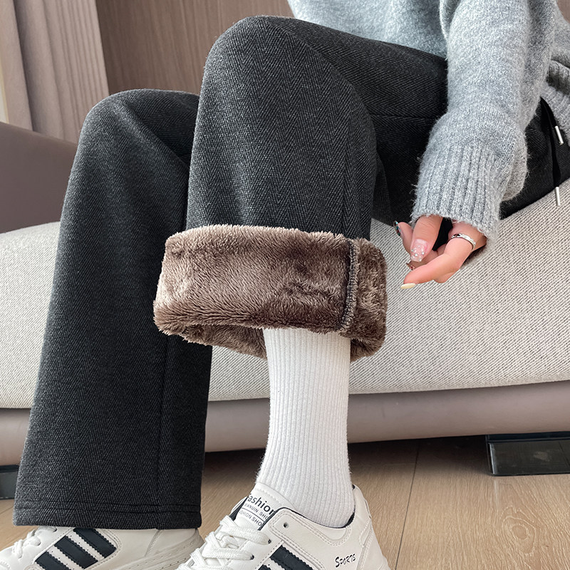 羊羔绒人字纹阔腿裤女冬季2025高腰休闲毛呢裤加绒大码窄版直筒裤