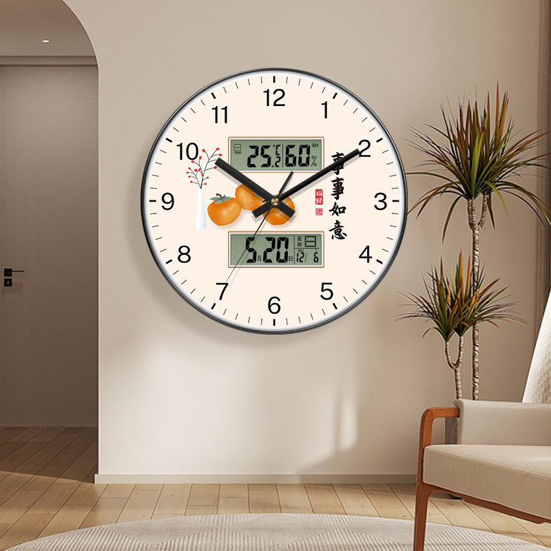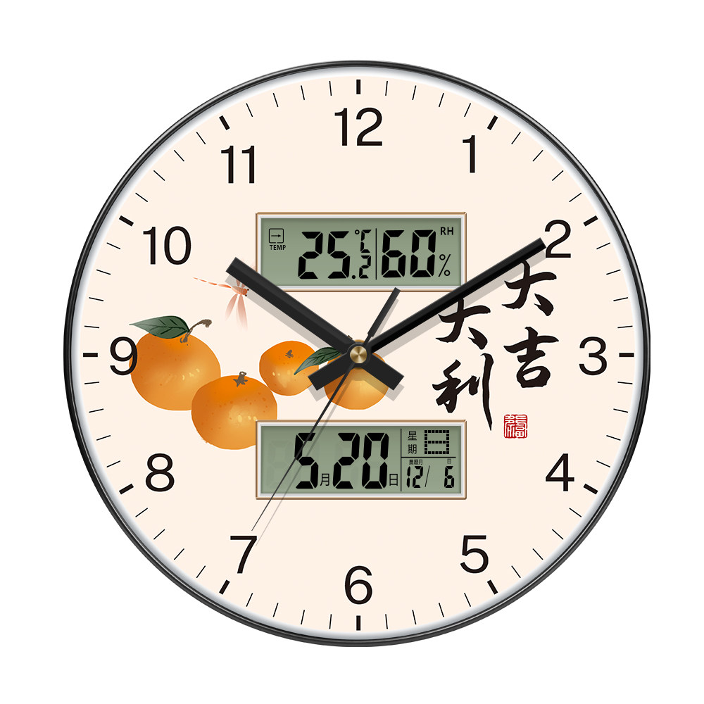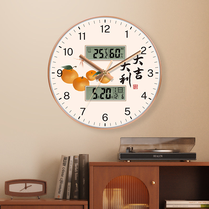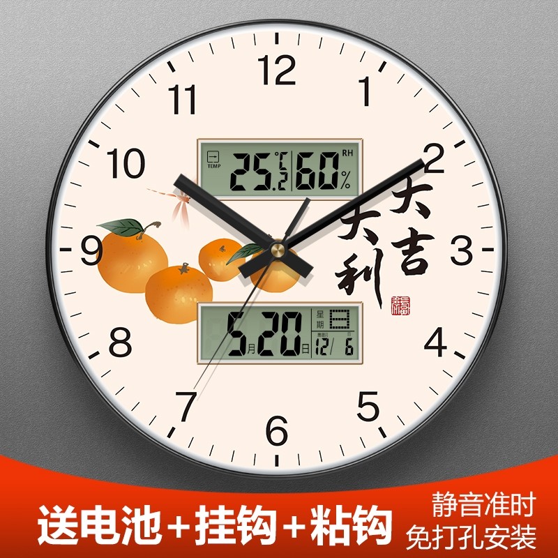 大吉大利家用新中式双日历挂钟客厅家用免打孔带温度时钟自动对时
