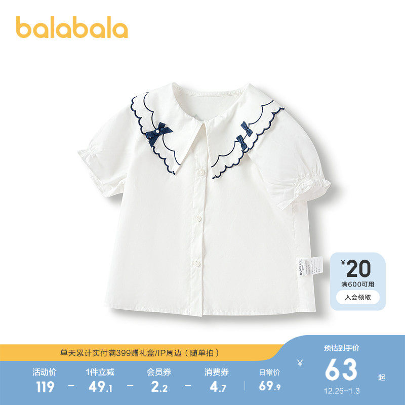 巴拉巴拉童装儿童短袖衬衫学院白衬衣女童夏装翻领上衣蝴蝶结可爱